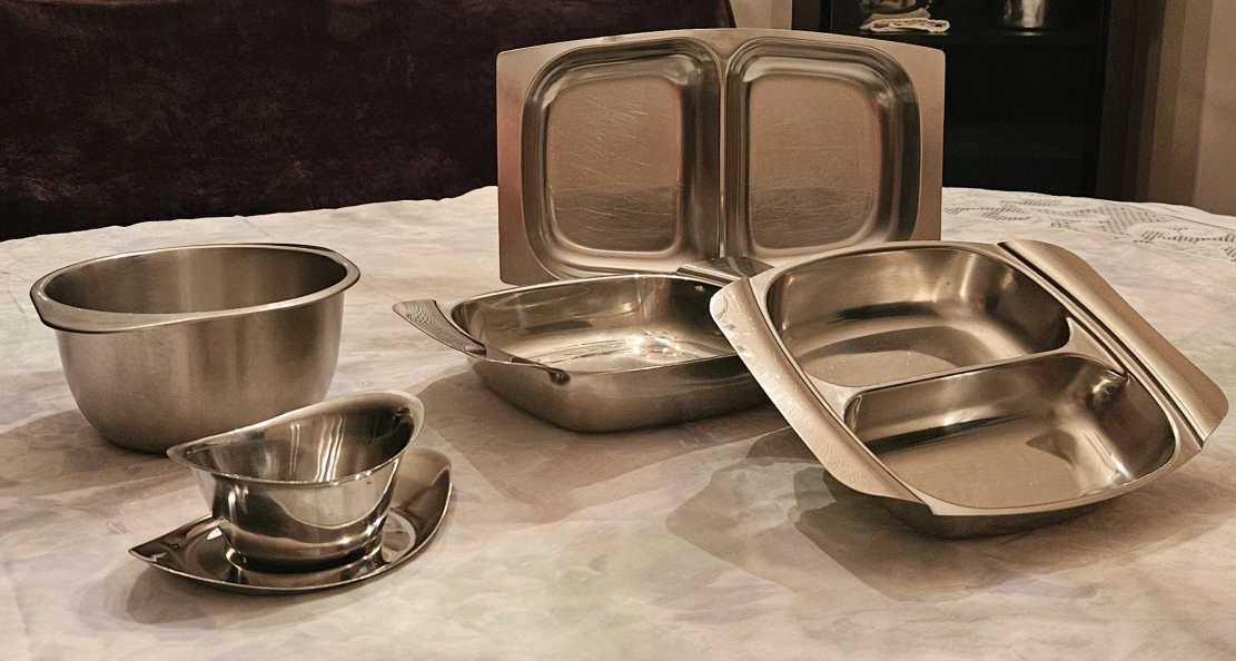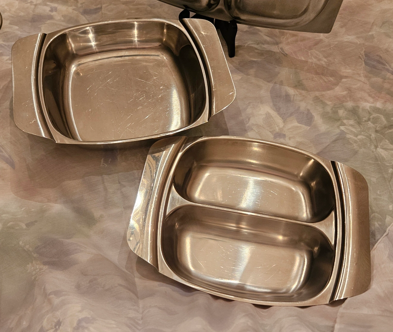 ●Vintage Mid-century Modern Stainless Steel Serving Dish Set ~ Vegetable Bowl & Divided Serving Dish
