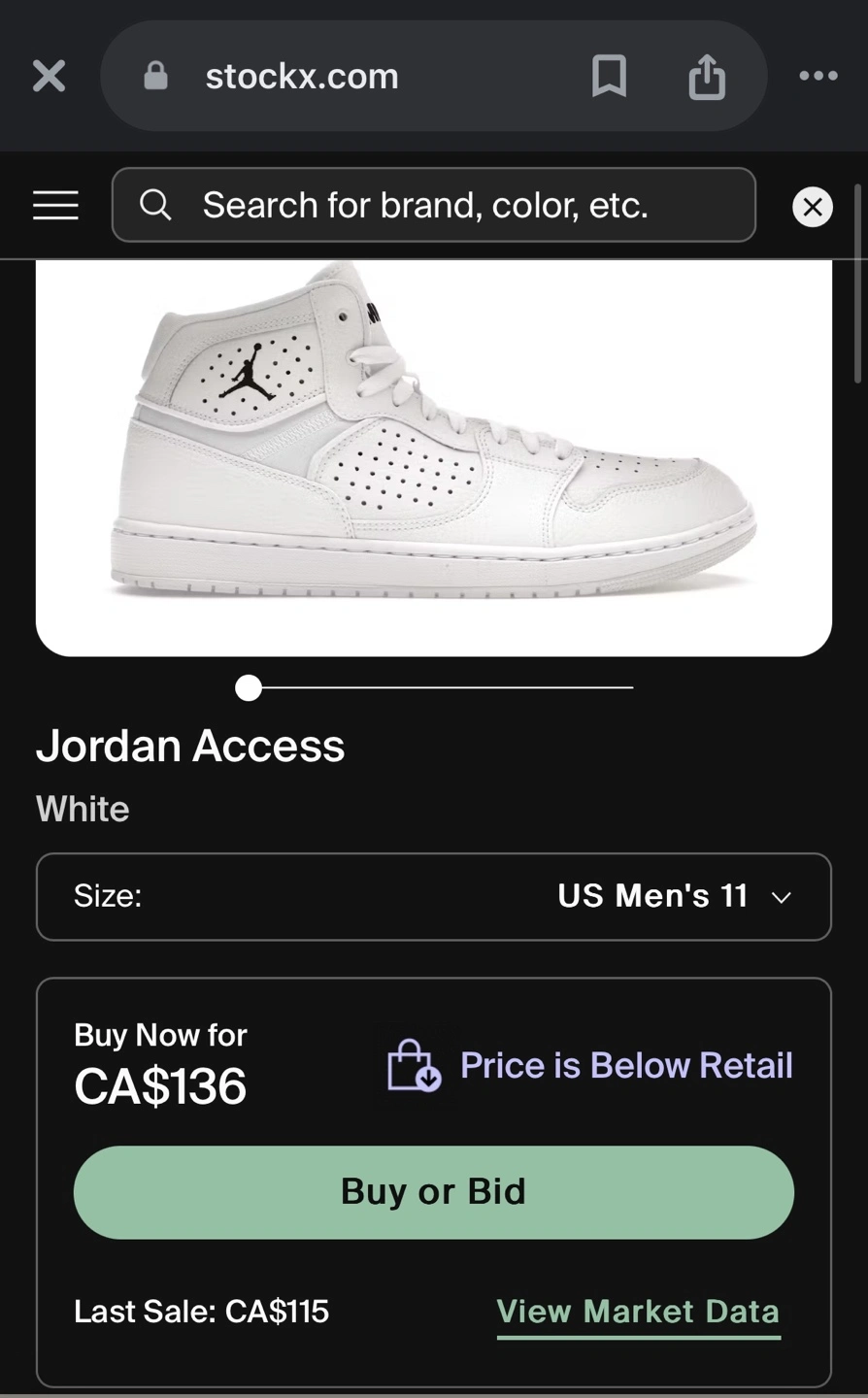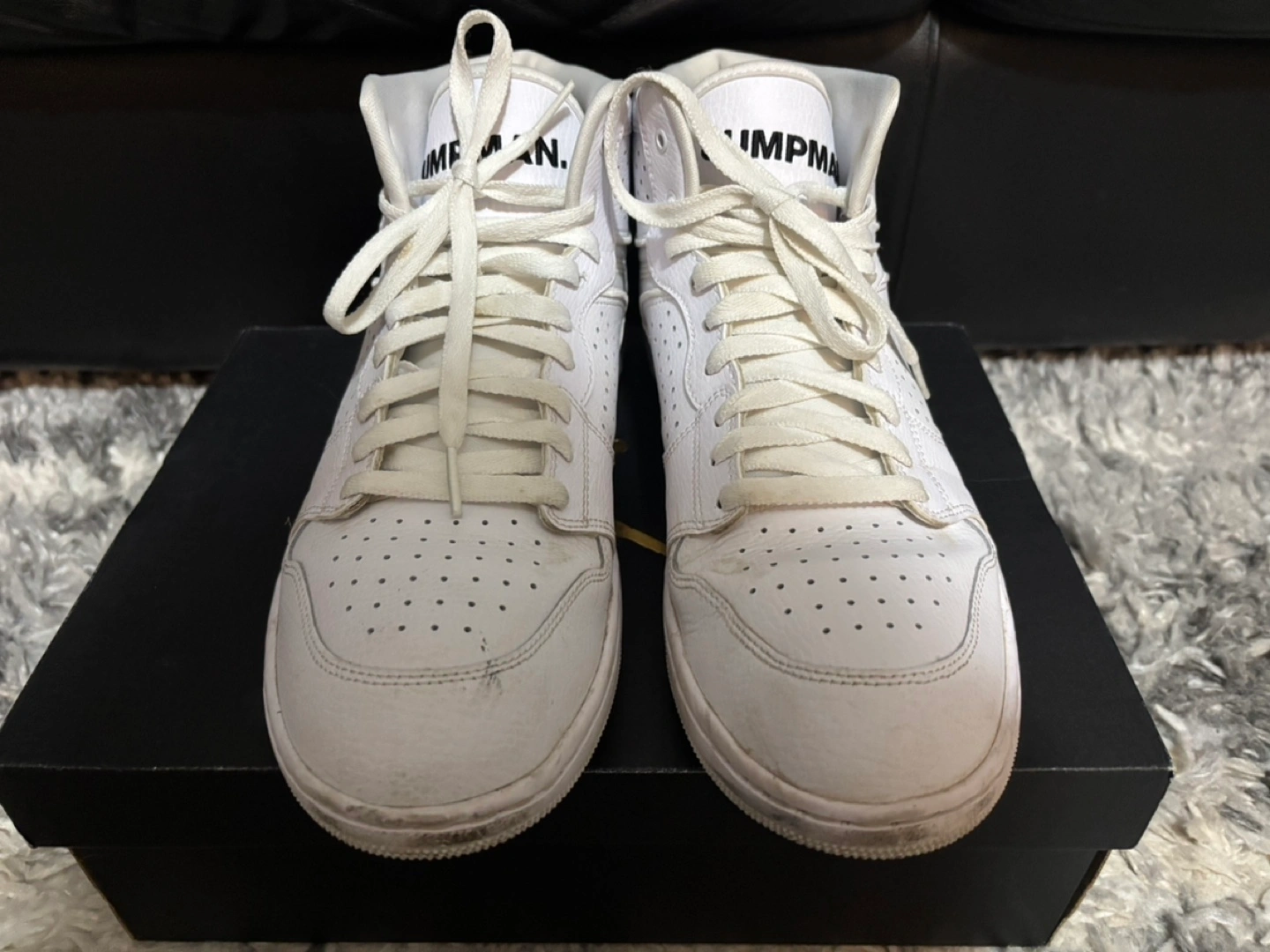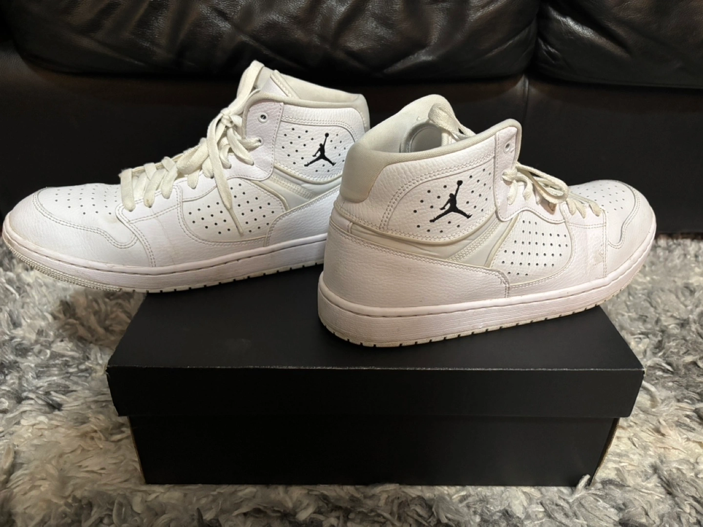 Men's Jordan Brand mid-top sneakers. White leather upper. Perforated detailing. Classic Jumpman logo. Used condition.