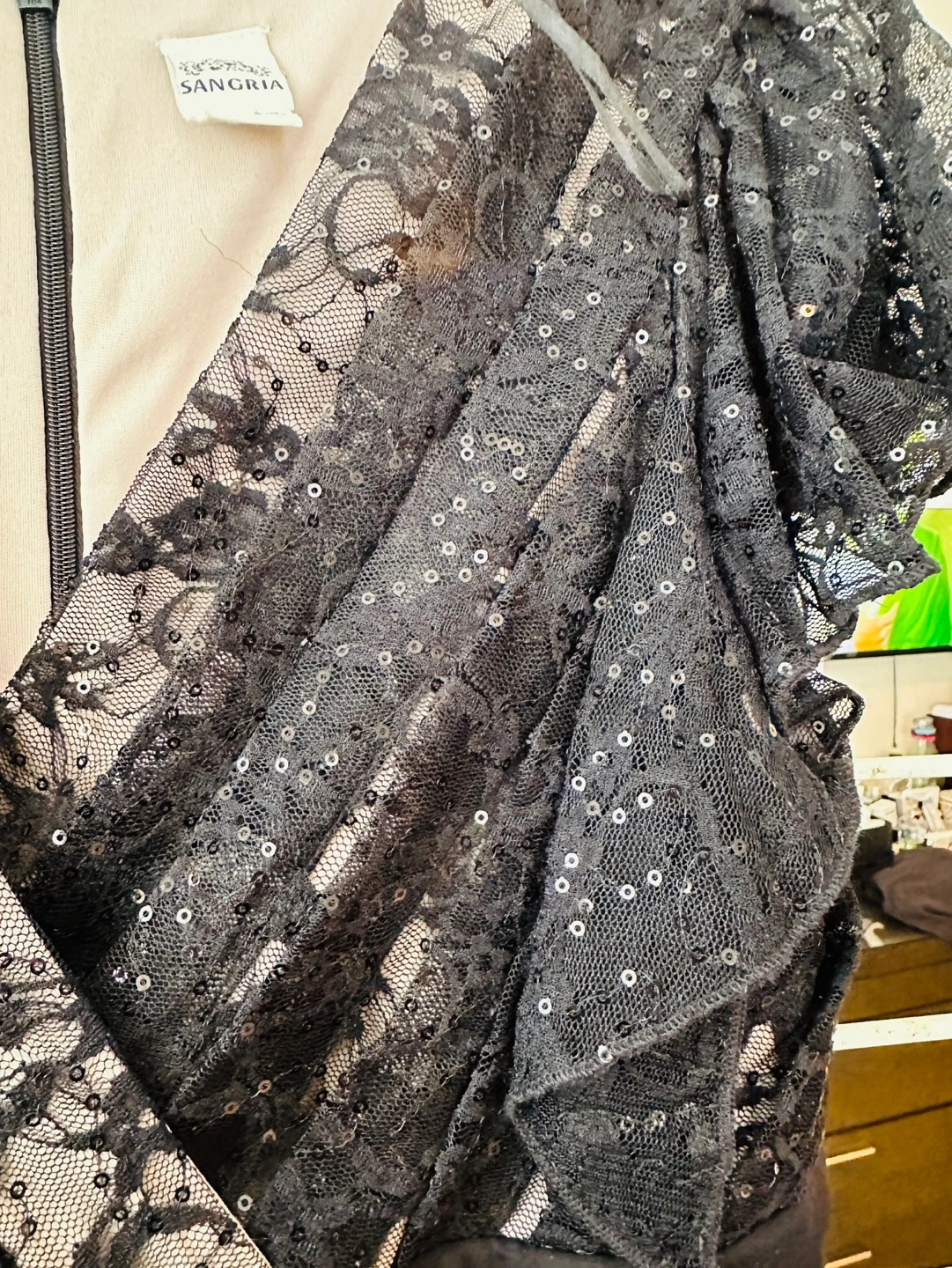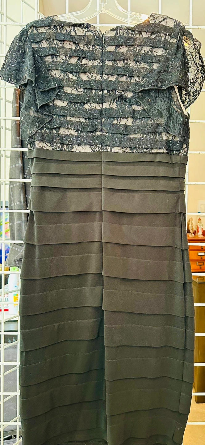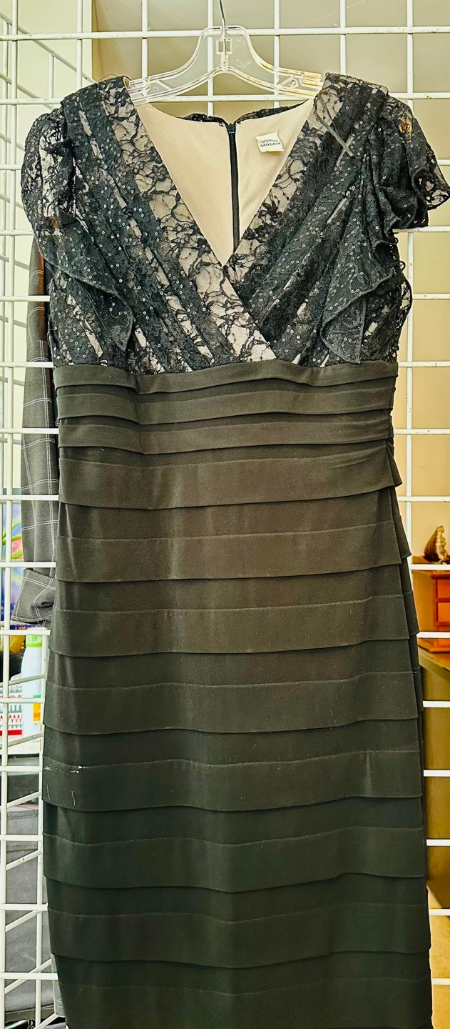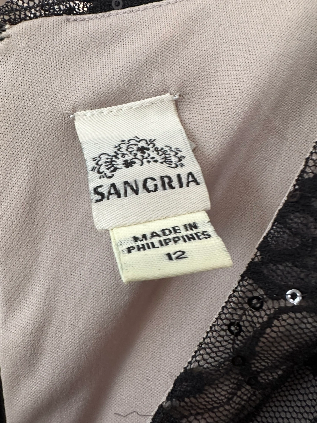 Stunning black cocktail dress. Features a beautiful black lace overlay with sequins on the bodice and shoulders. Fitted silhouette with a ruched skirt. Size 12. Made in the Philippines.