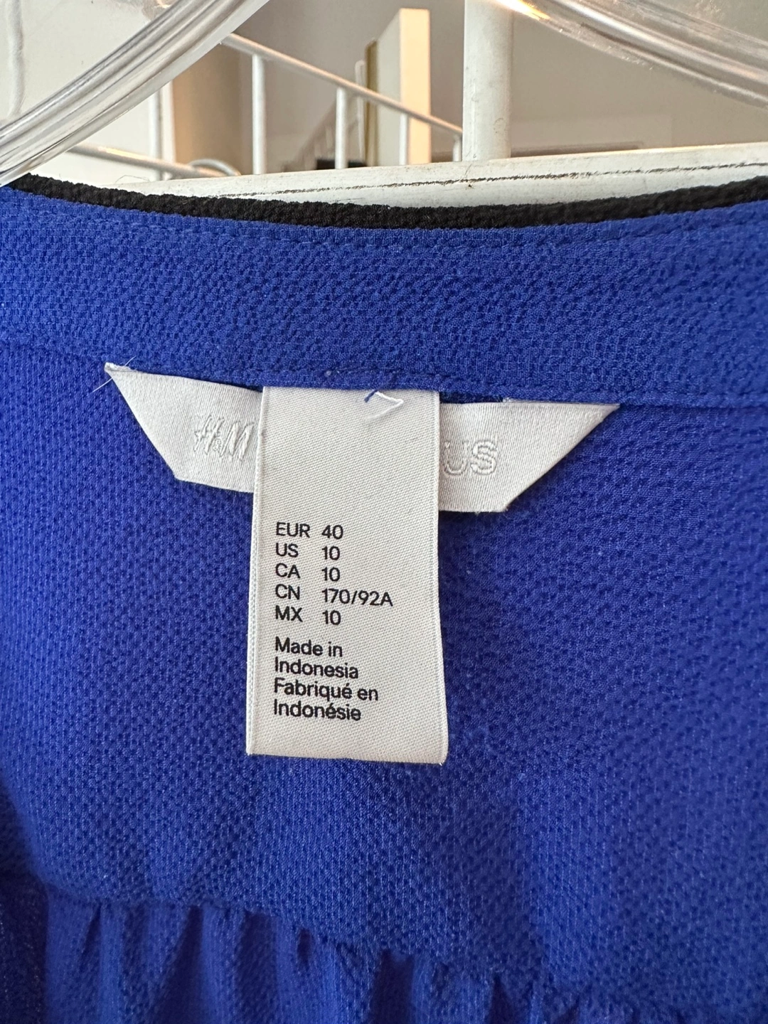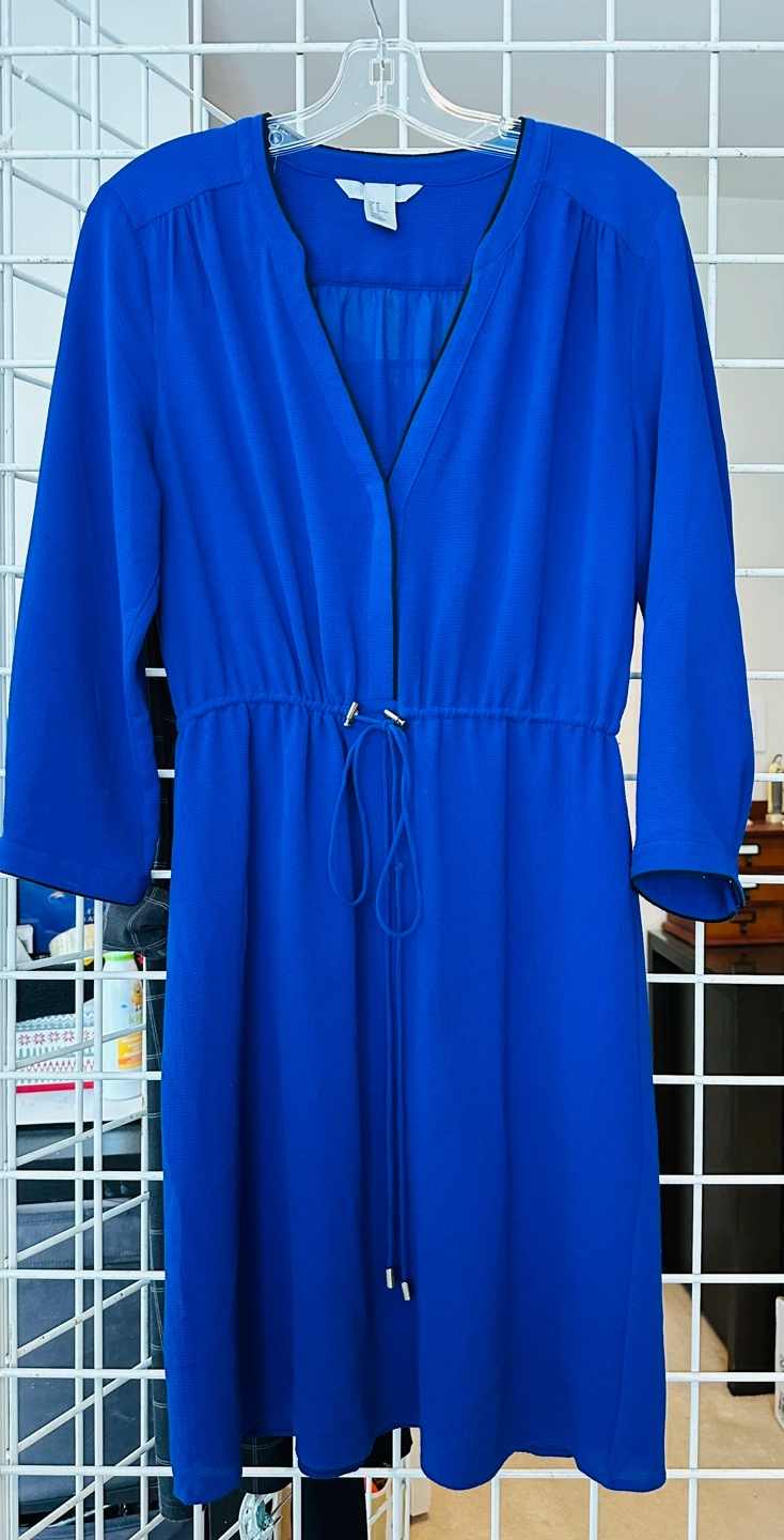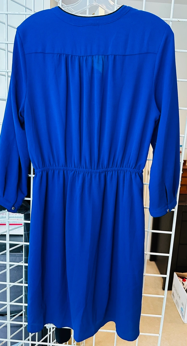 Gorgeous royal blue mini dress. Three-quarter sleeves. Elastic waist. V-neckline. Zipper detail at neckline. Made in Indonesia.