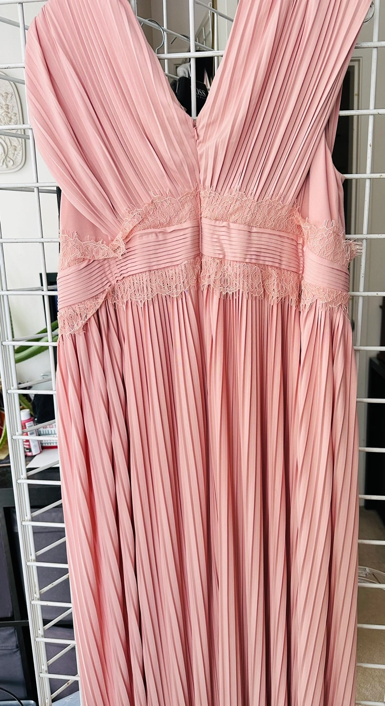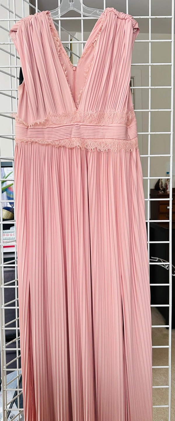 Beautiful blush pink maxi dress. Features pleated fabric and delicate lace accents. V-neckline and sleeveless. Perfect for a special occasion.