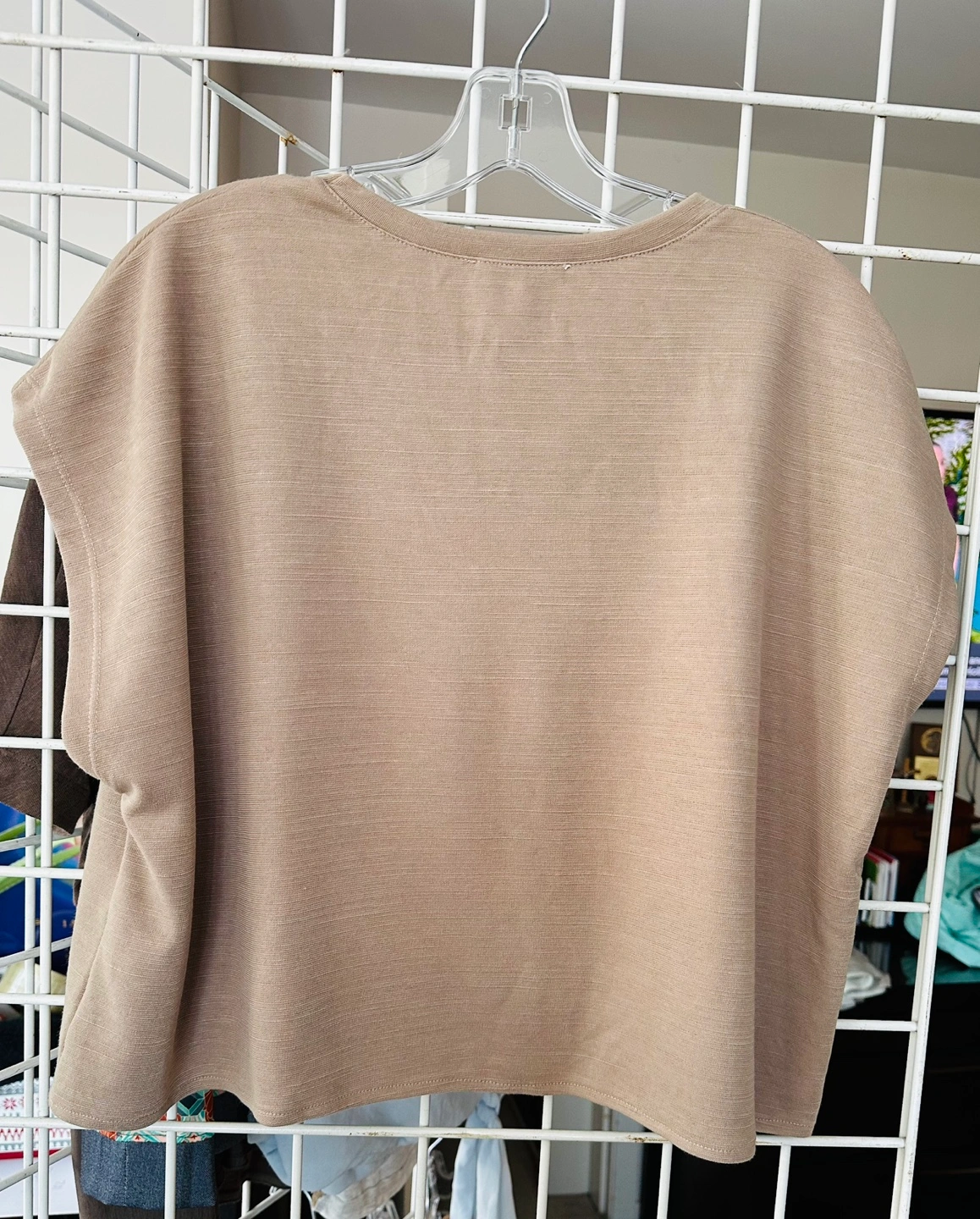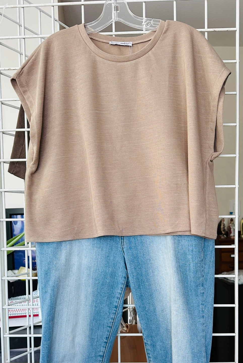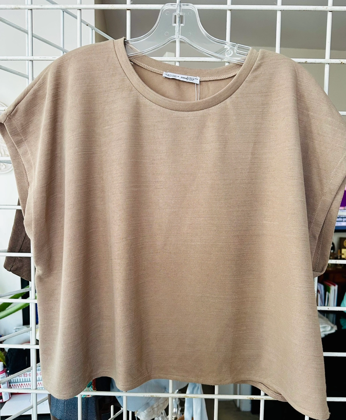 Taupe cropped t-shirt. Size M. Short sleeves. Relaxed fit. Made in Portugal.