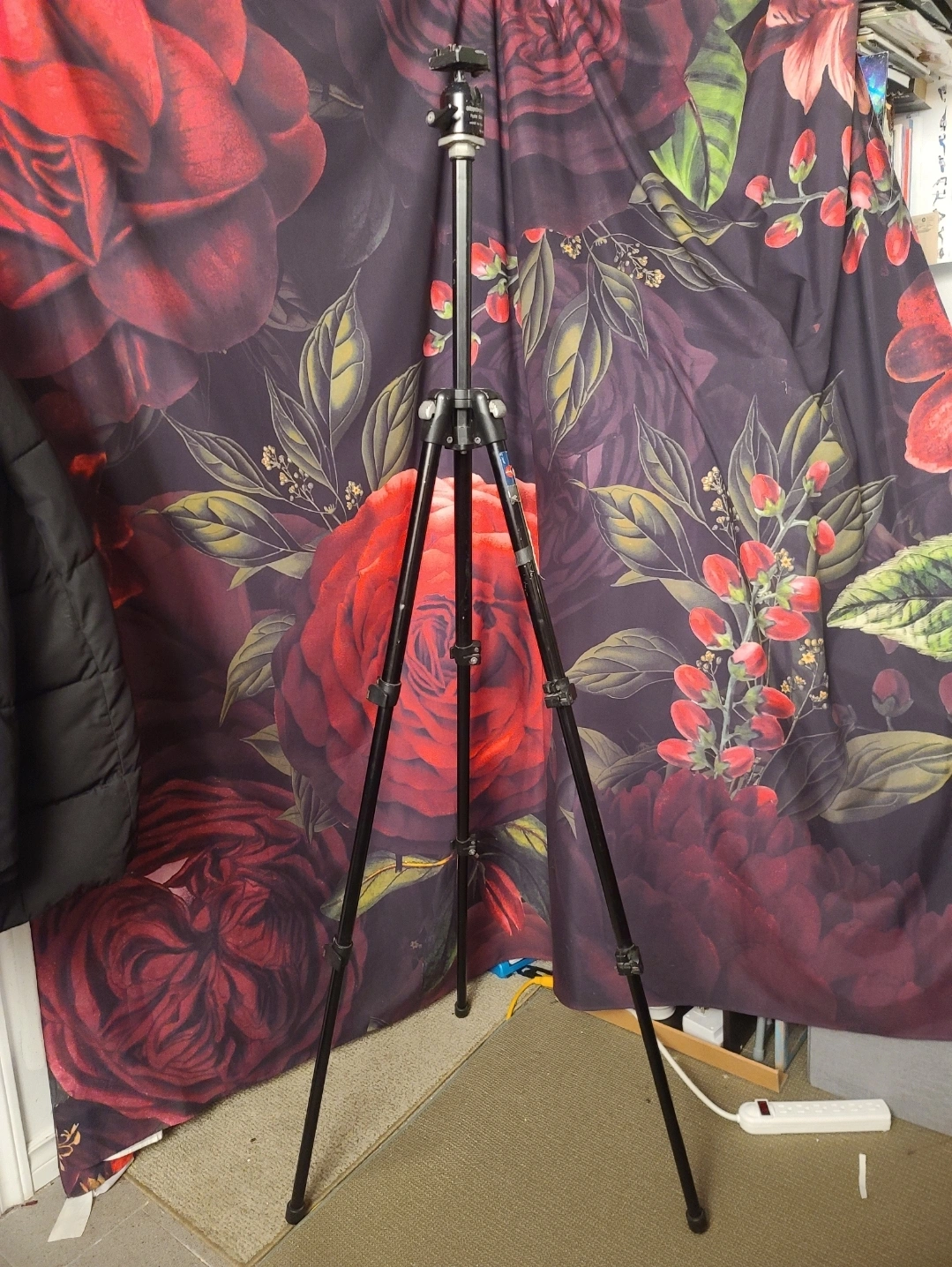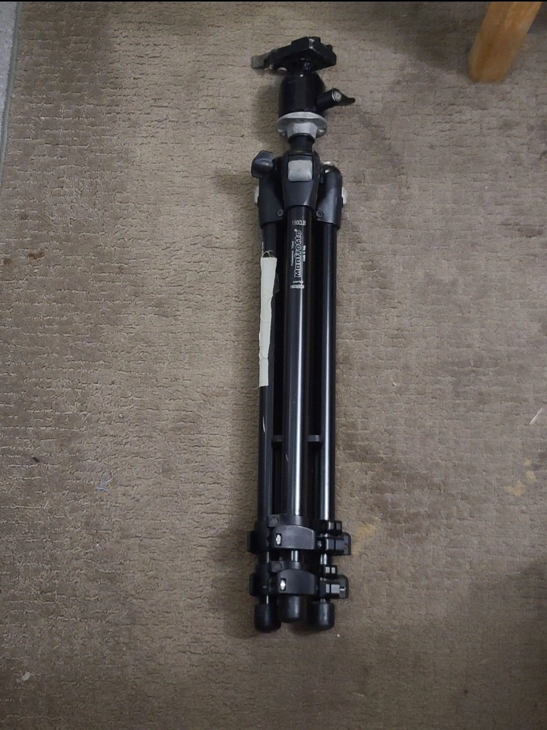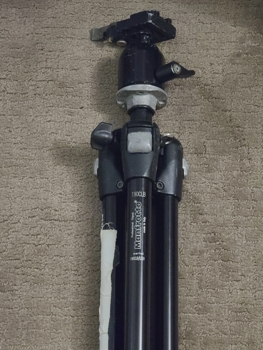 Black Manfrotto tripod, adjustable height. Good used condition. Includes ball head, but needs new quick release plate. Model number 190CLB.