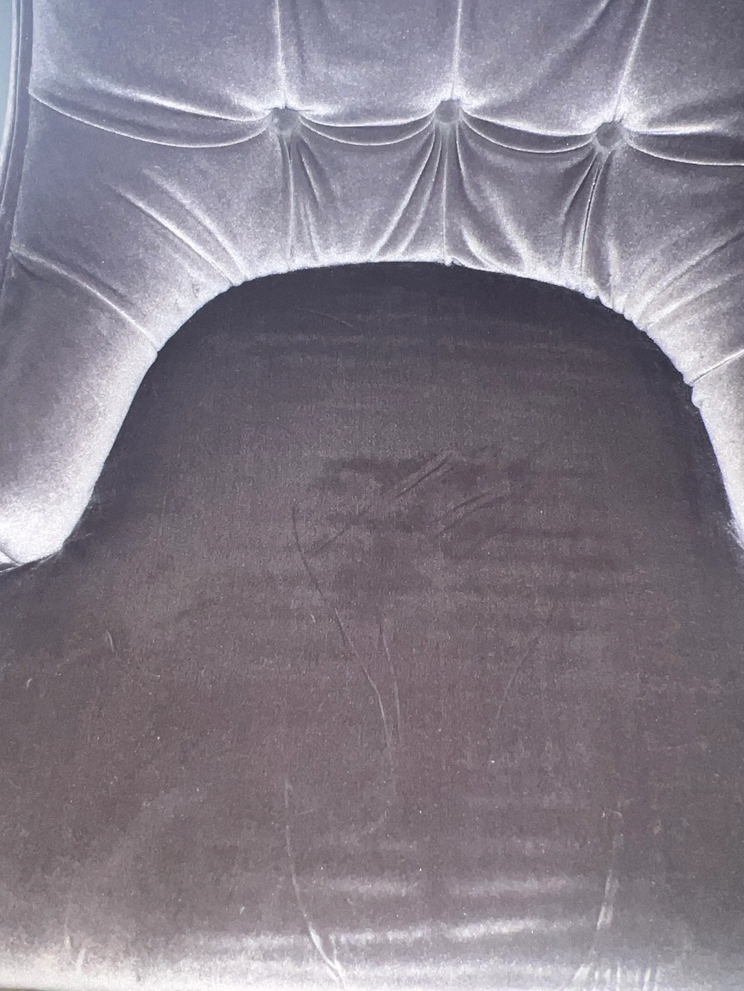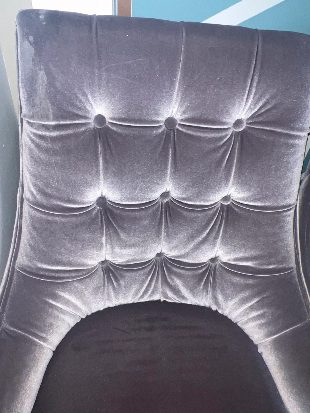 Grey velvet dining chairs. Button tufted backs. Slight wear visible. Modern design. Black legs. $50 per chair. I have 3 chairs