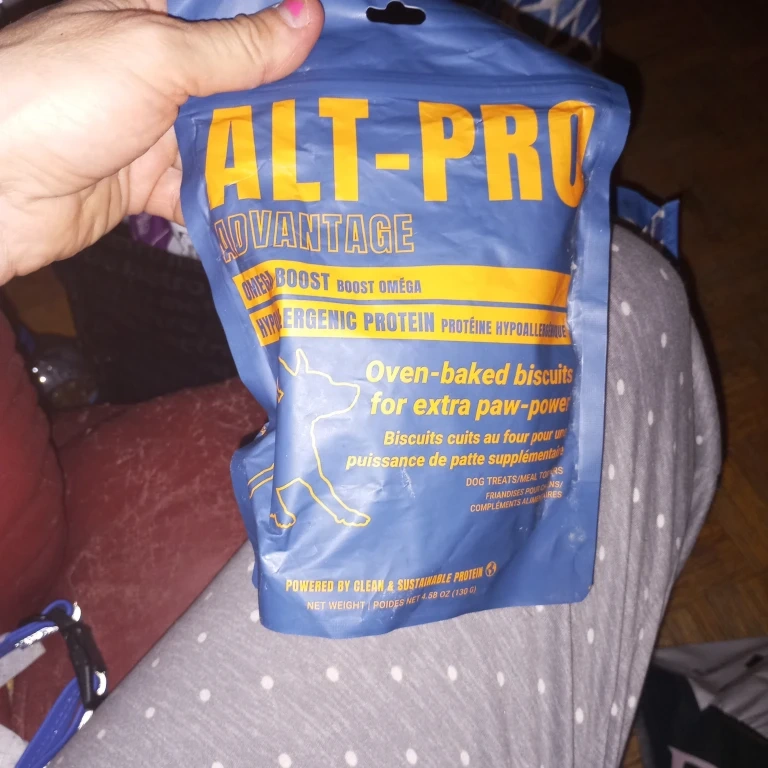 ALT-PRO Advantage oven-baked biscuits for dogs. These treats are made with hypoallergenic protein and boosted with omega. Net weight is 4.58 oz (130g).