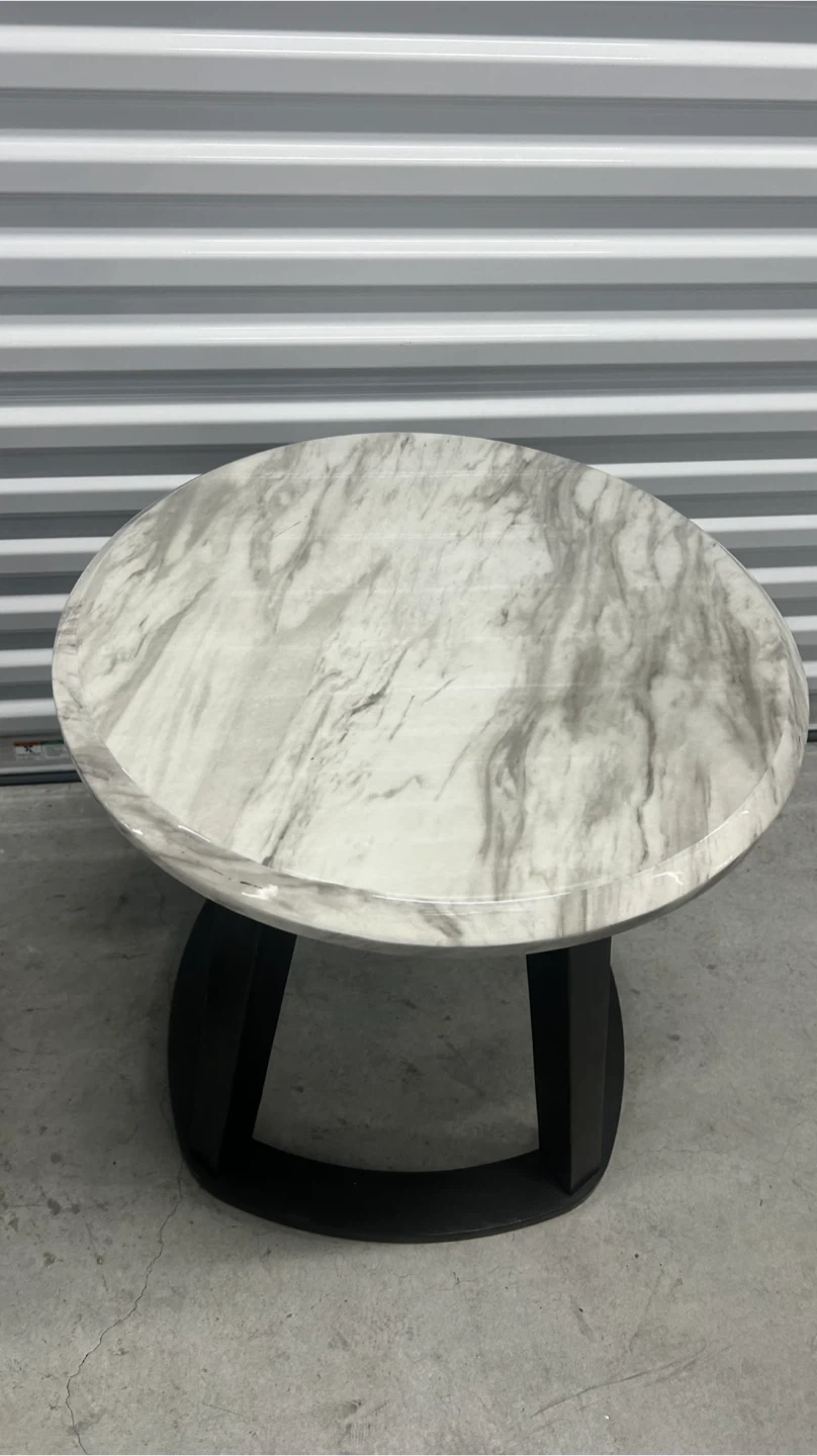This set includes two round side tables with a faux marble top and black metal base. They're perfect for adding a touch of modern style to your living room or bedroom. Table tops feature a marble-like finish. Black metal bases provide sturdy support.