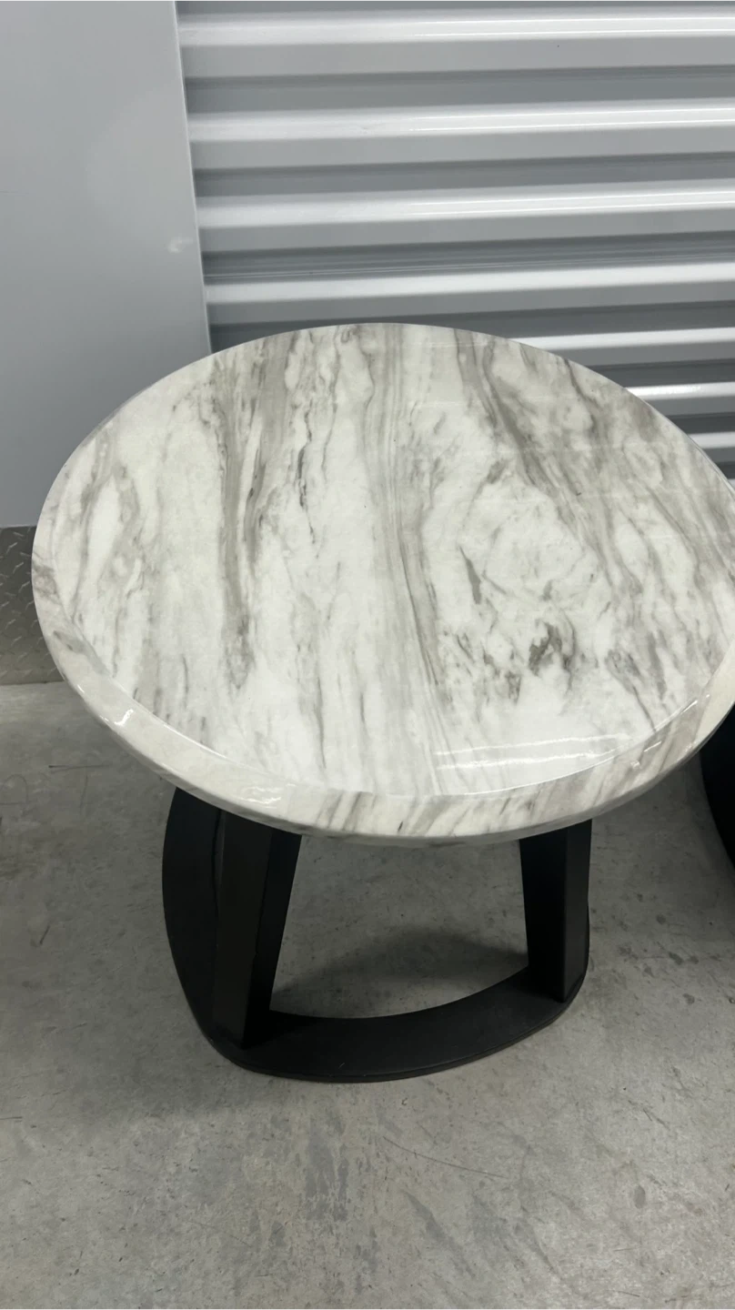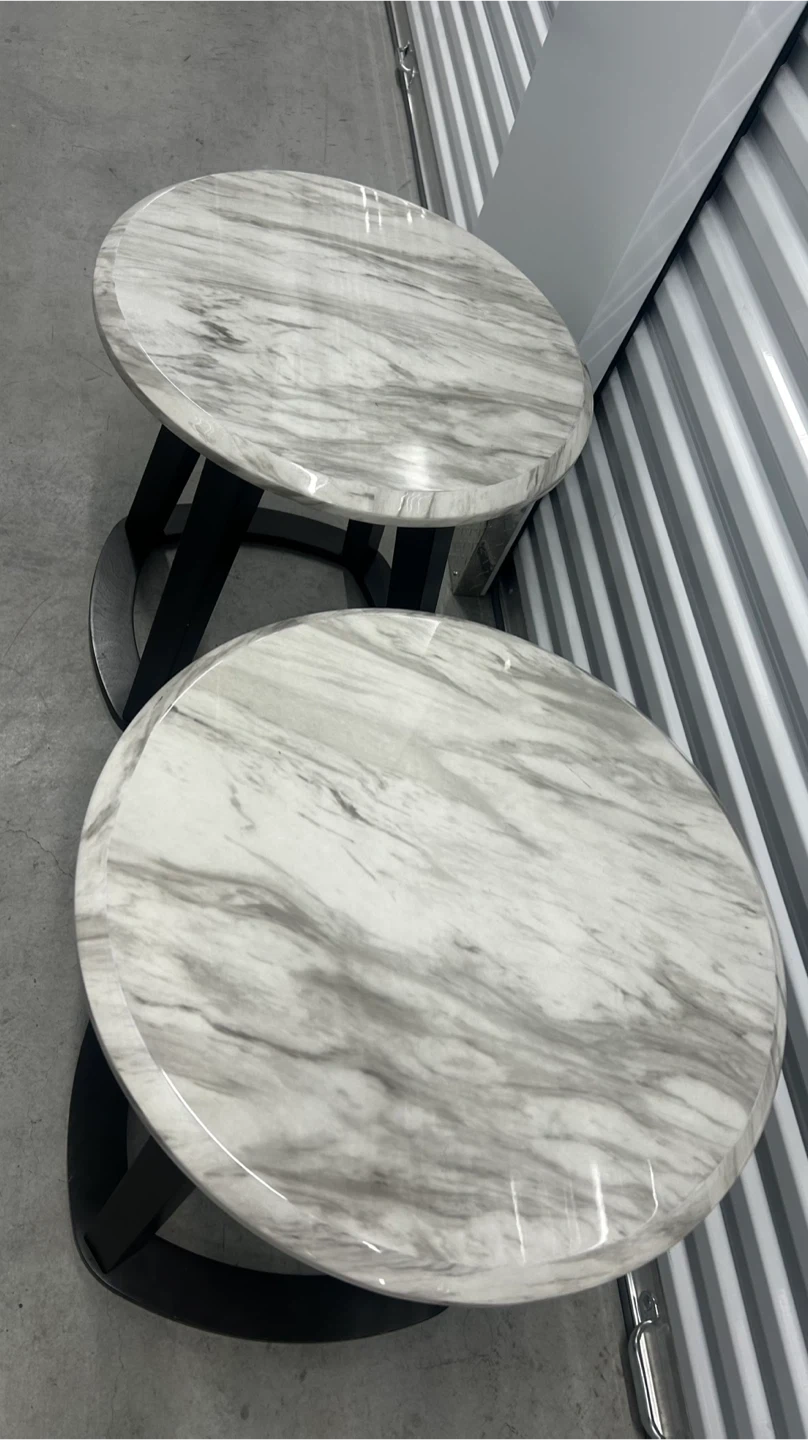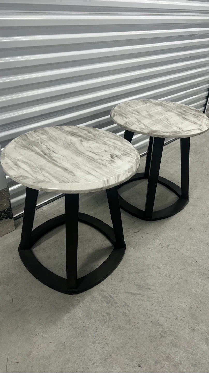 This set includes two round side tables with a faux marble top and black metal base. They're perfect for adding a touch of modern style to your living room or bedroom. Table tops feature a marble-like finish. Black metal bases provide sturdy support.
