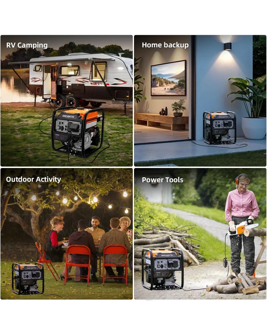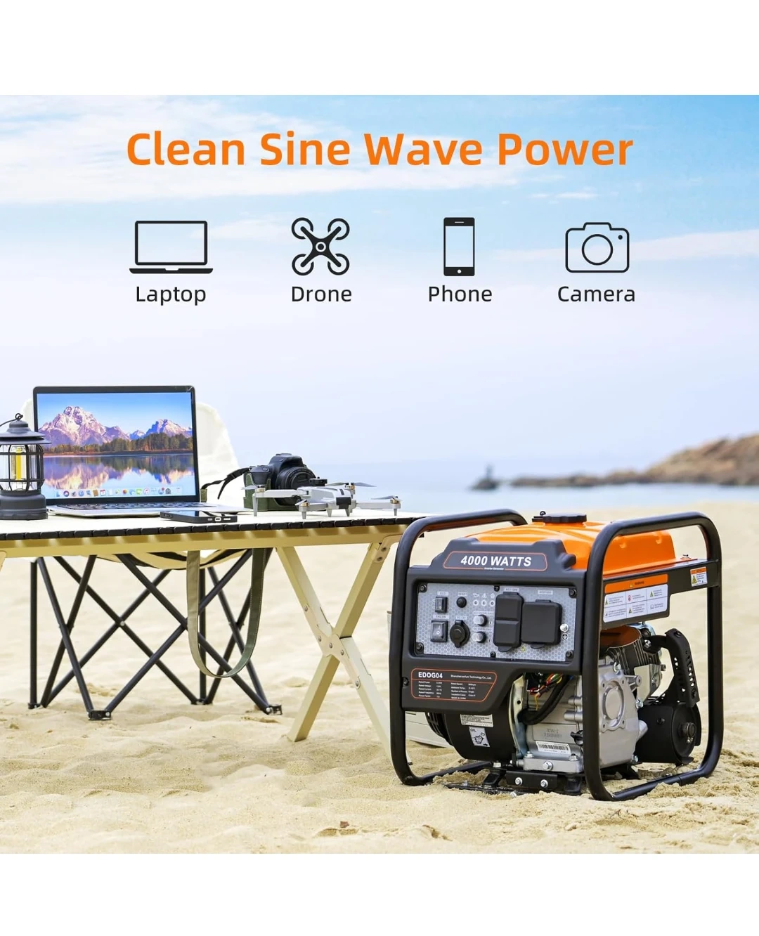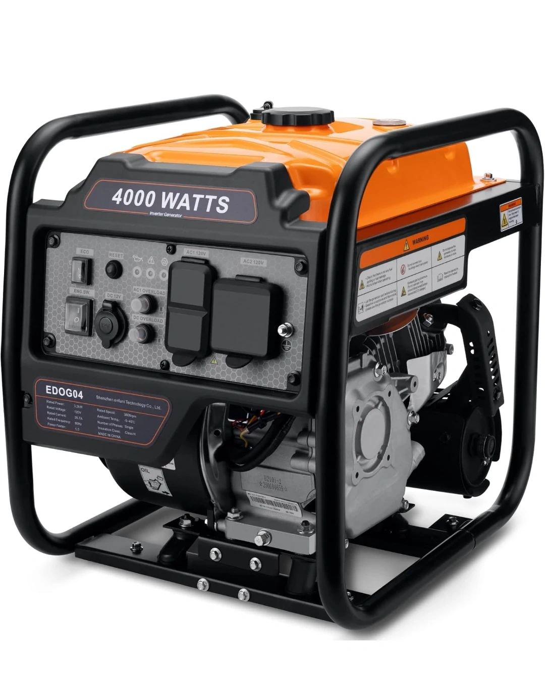 This 4000W inverter generator features a 208CC 4-stroke OHV engine and a 2gal/7.5L fuel capacity. It has an ECO mode for fuel saving and long runtime. Includes overload protection and an oil sensor.