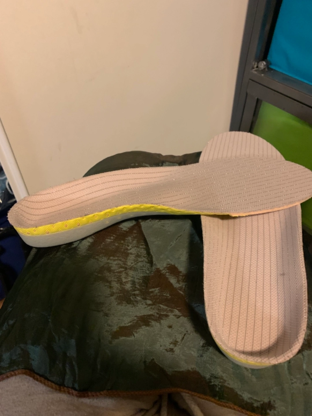 1 pair of big (men’s) insoles. yellow and green gel cushioning. Comfortable and supportive. Good for various footwear.