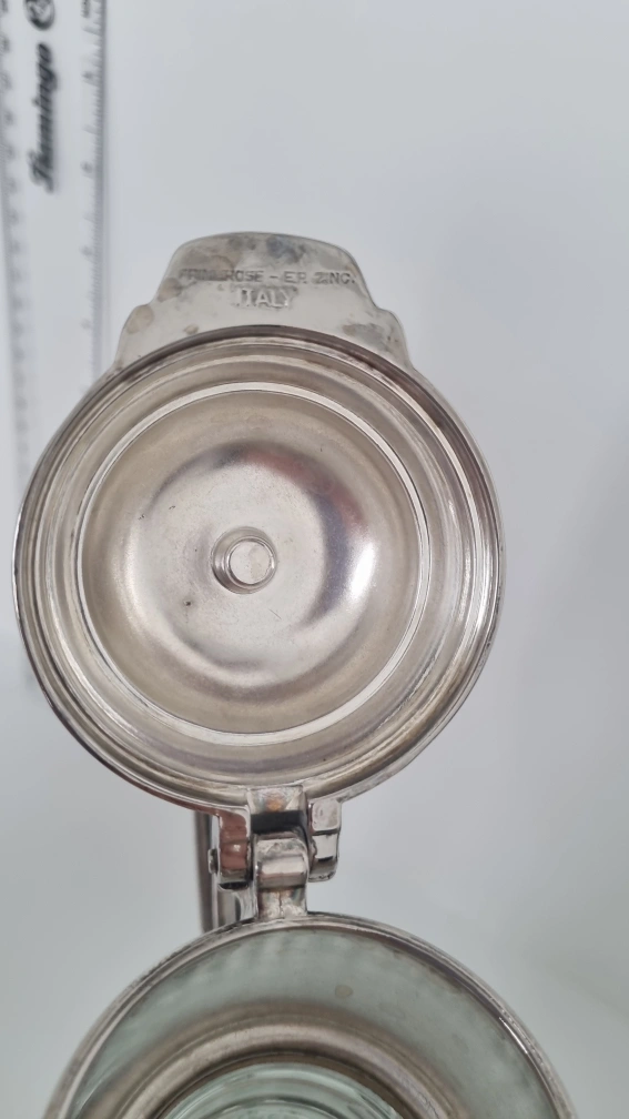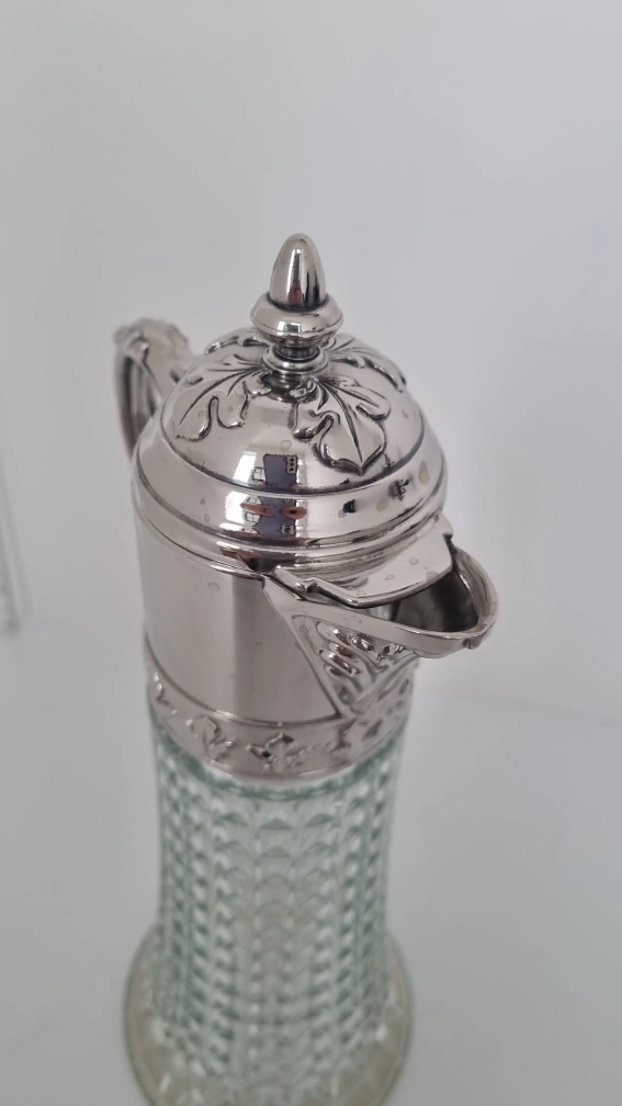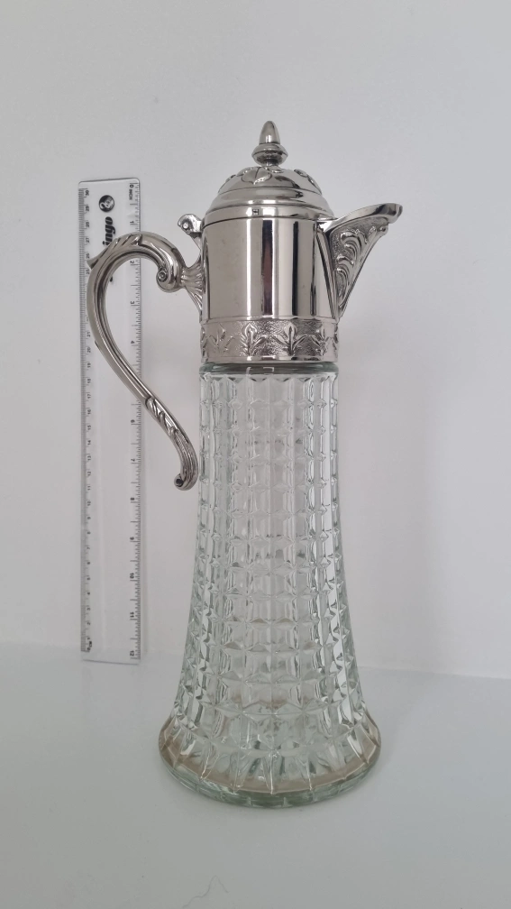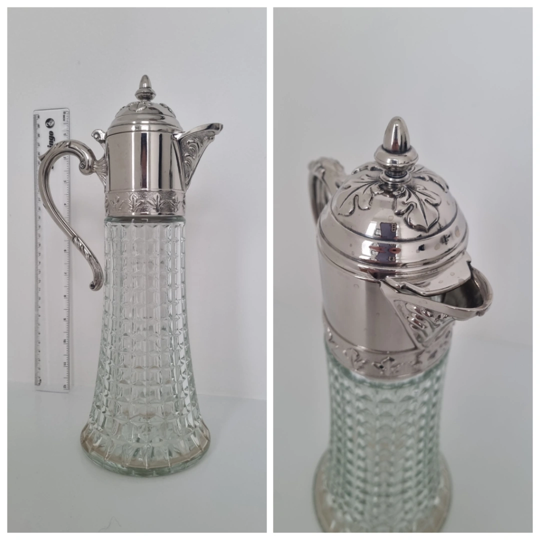 Made in Italy. Elegant vintage decanter. Features a clear, faceted crystal body and a silver-plated top. Beautiful detail work on the lid and handle. Perfect for serving or display.