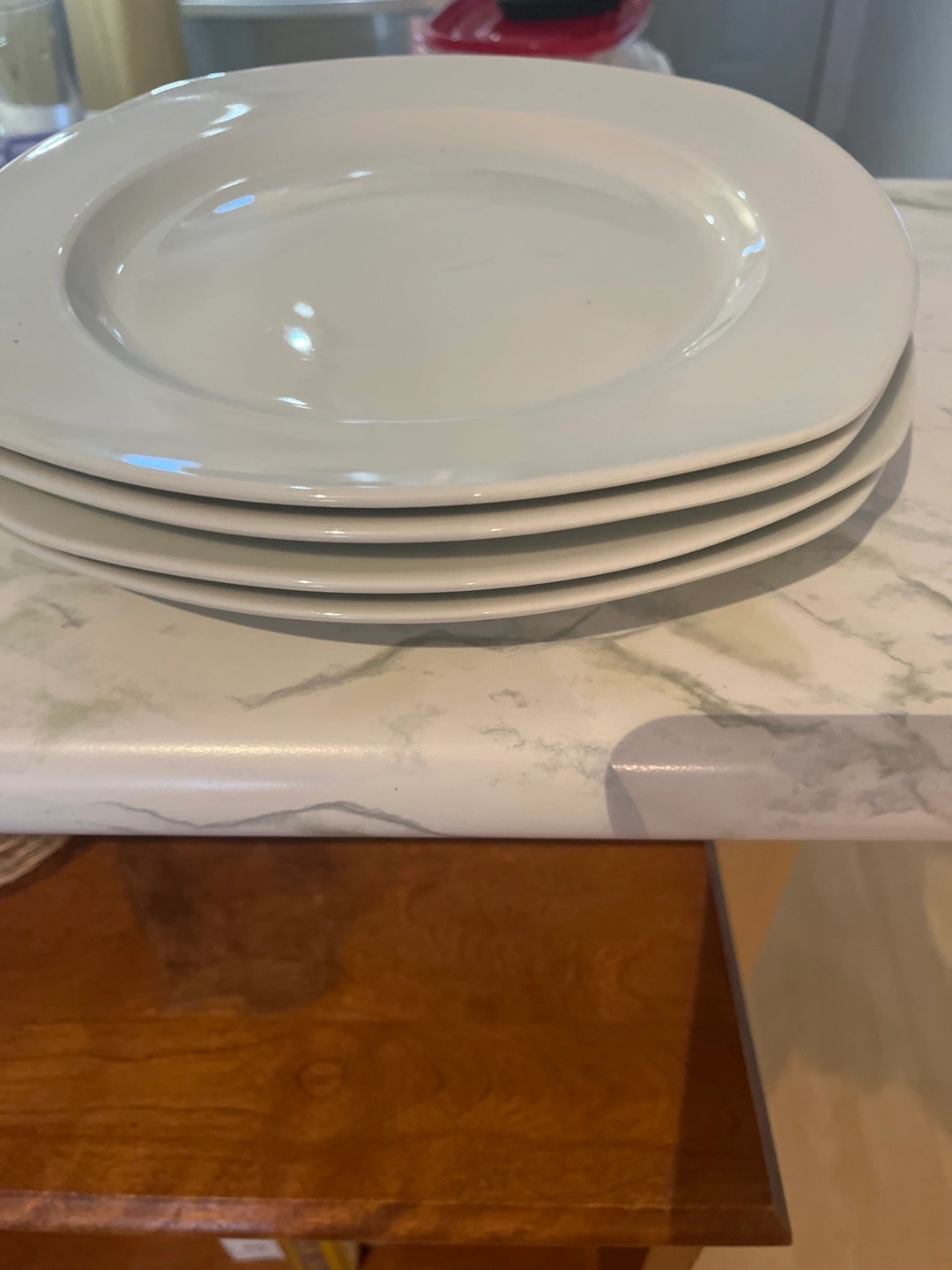 162Three white porcelain dinner plates. Simple design. Stackable. Great for everyday use. Medium size