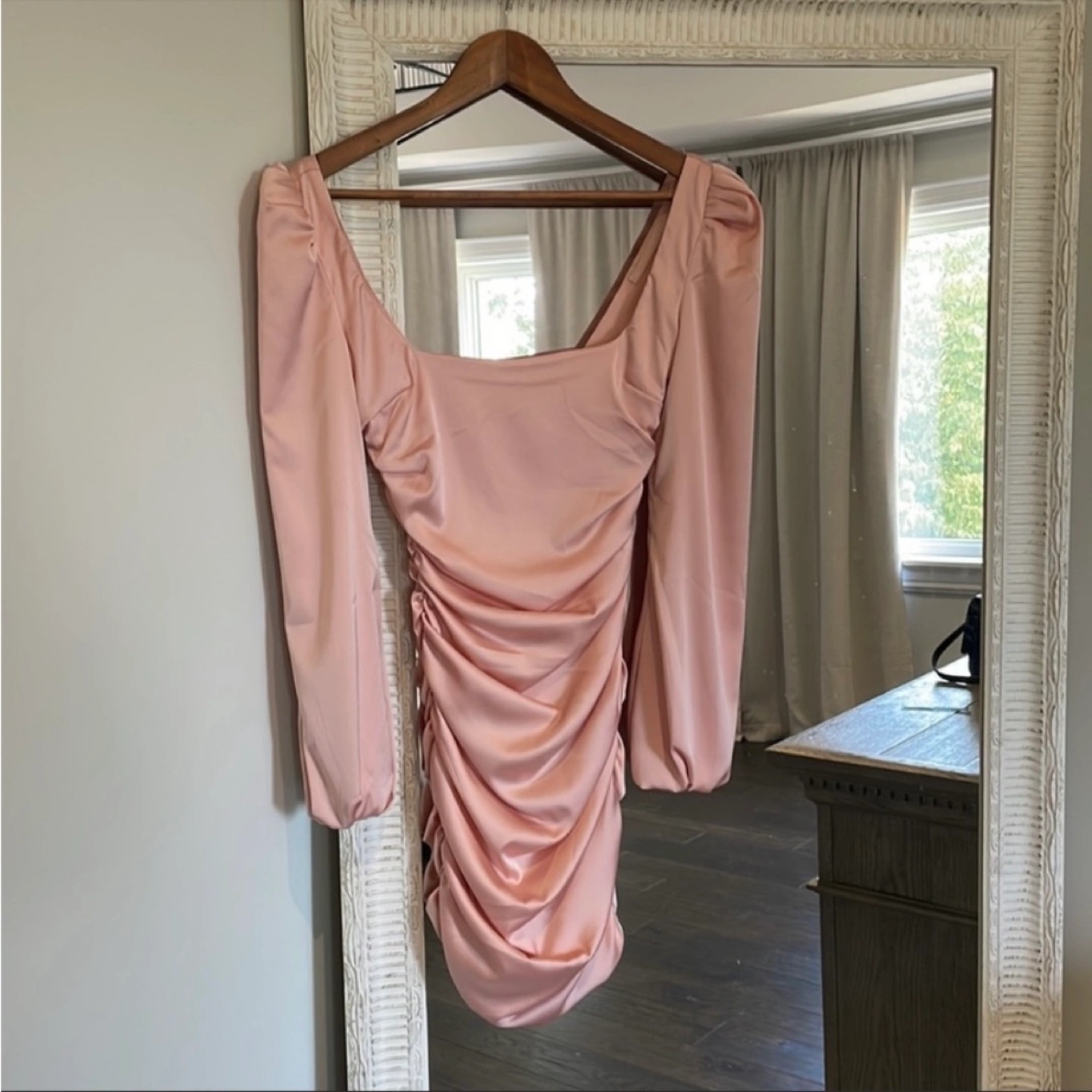 252Stunning blush pink mini dress. Features long sleeves, a square neckline, and a ruched bodice. Good condition. Open to sale or trade.
