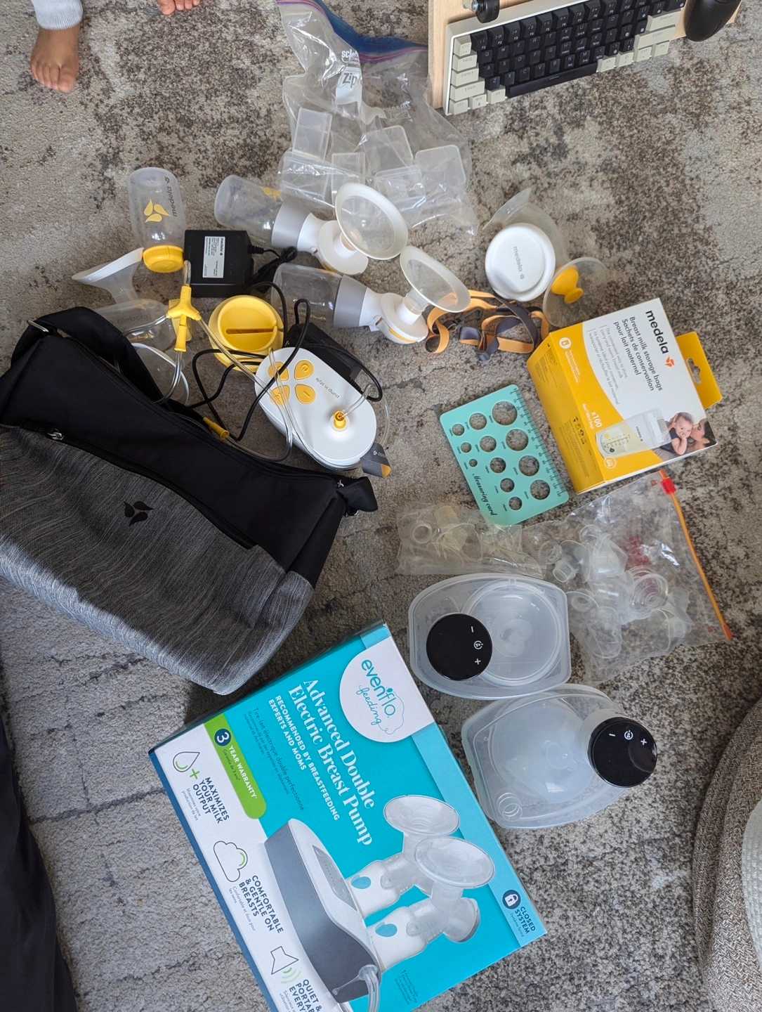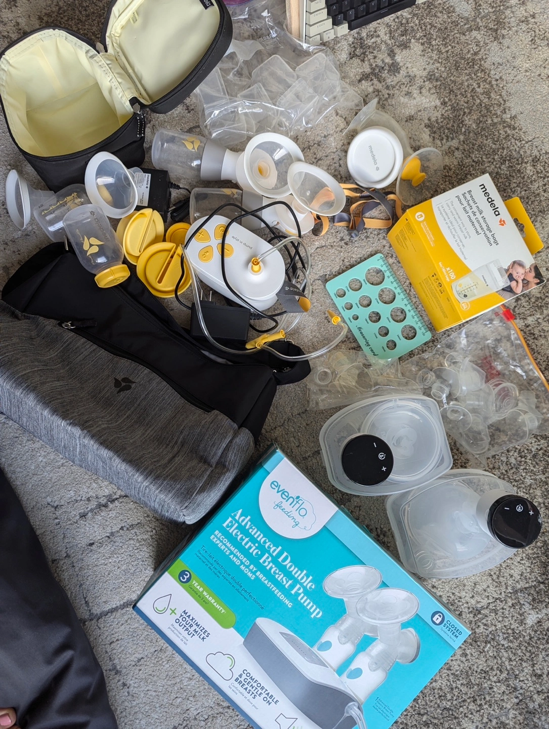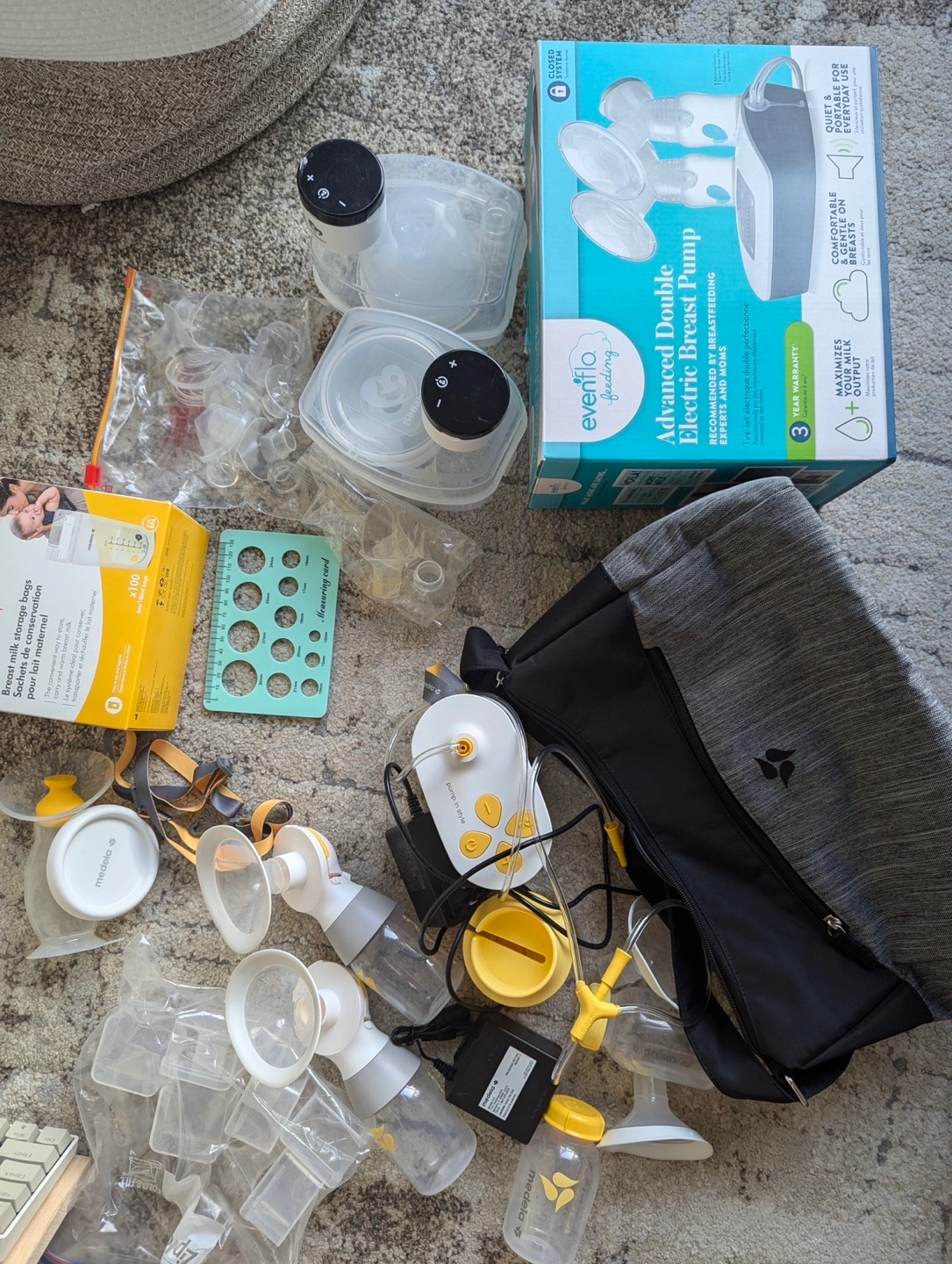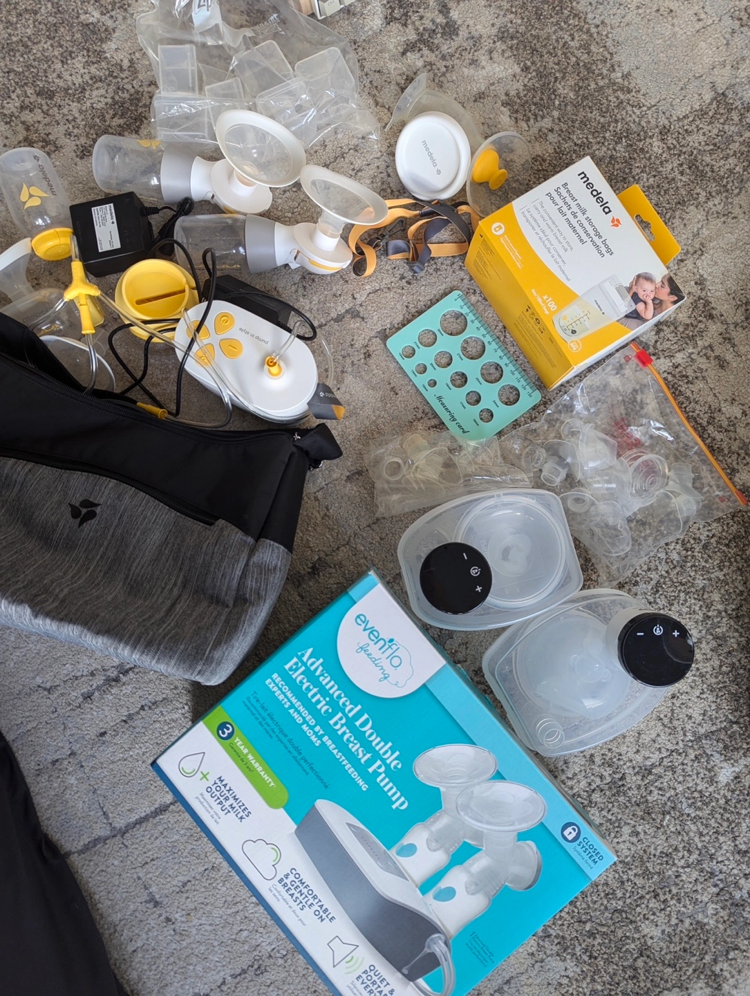 Evenflo Advanced Double Electric Breast Pump. Includes various pump parts, bottles, and Medela breast milk storage bags. Carrying bag and insulated bag also included.