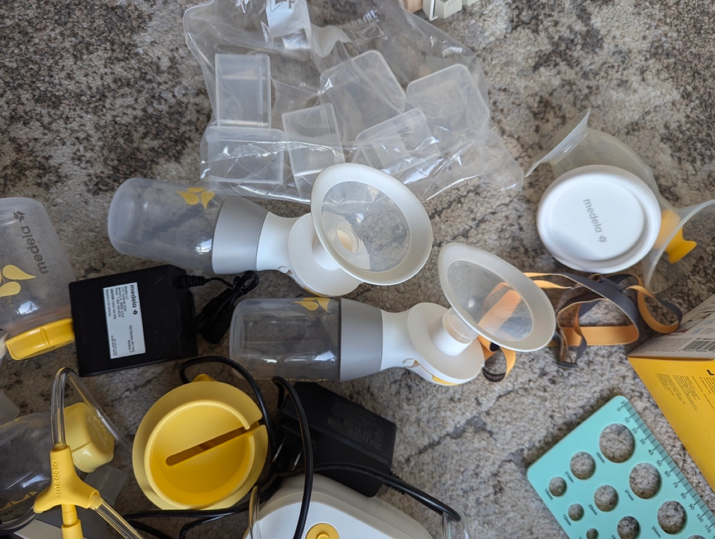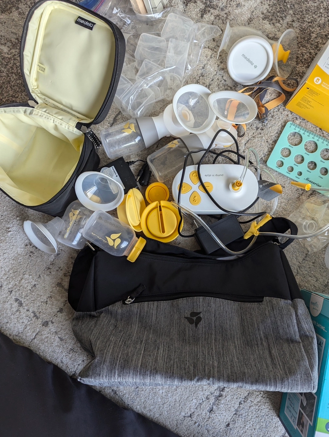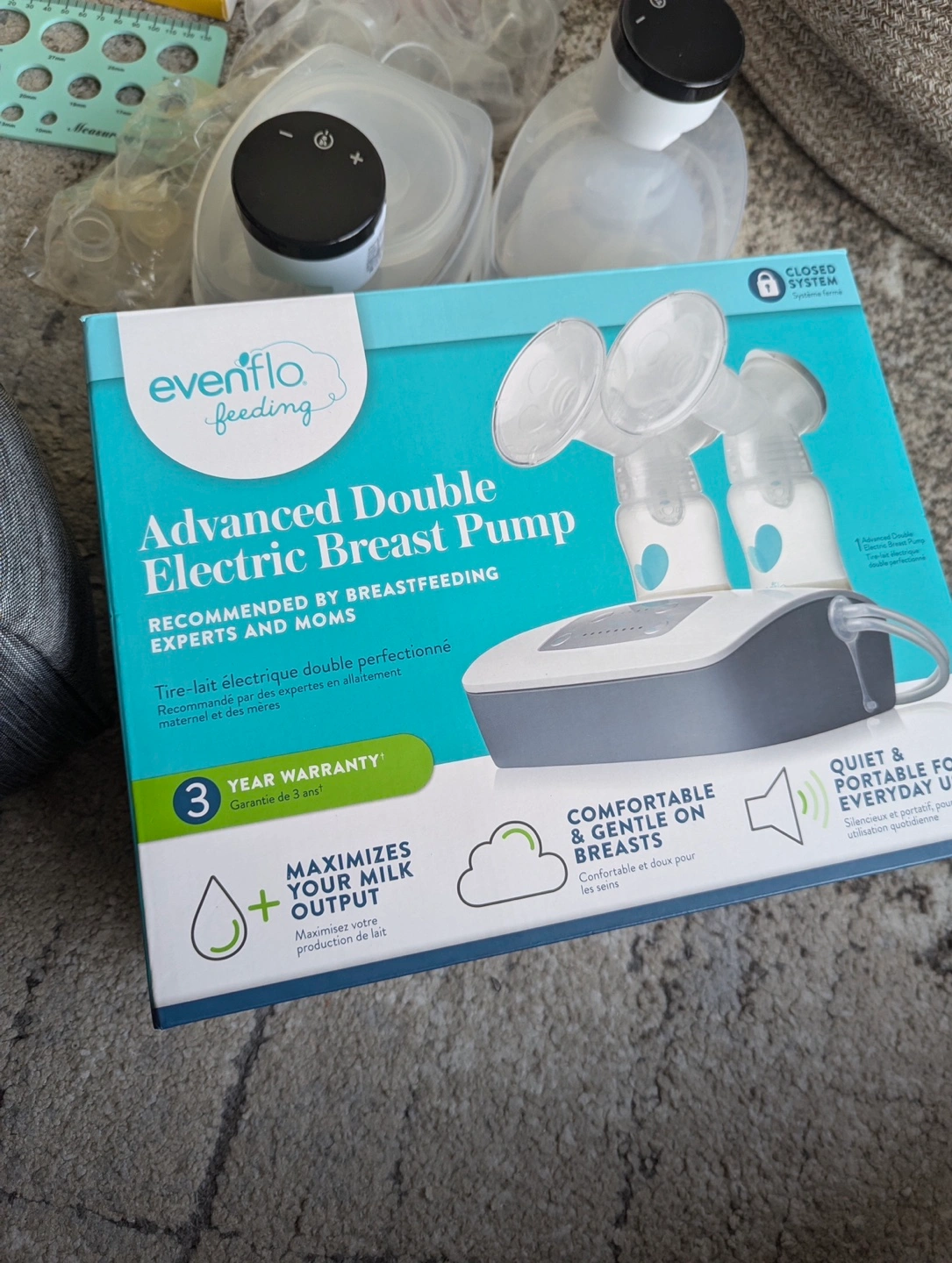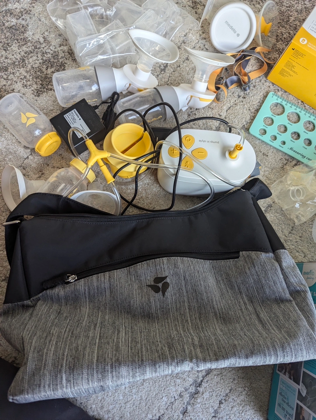 Evenflo Advanced Double Electric Breast Pump. Includes various pump parts, bottles, and Medela breast milk storage bags. Carrying bag and insulated bag also included.