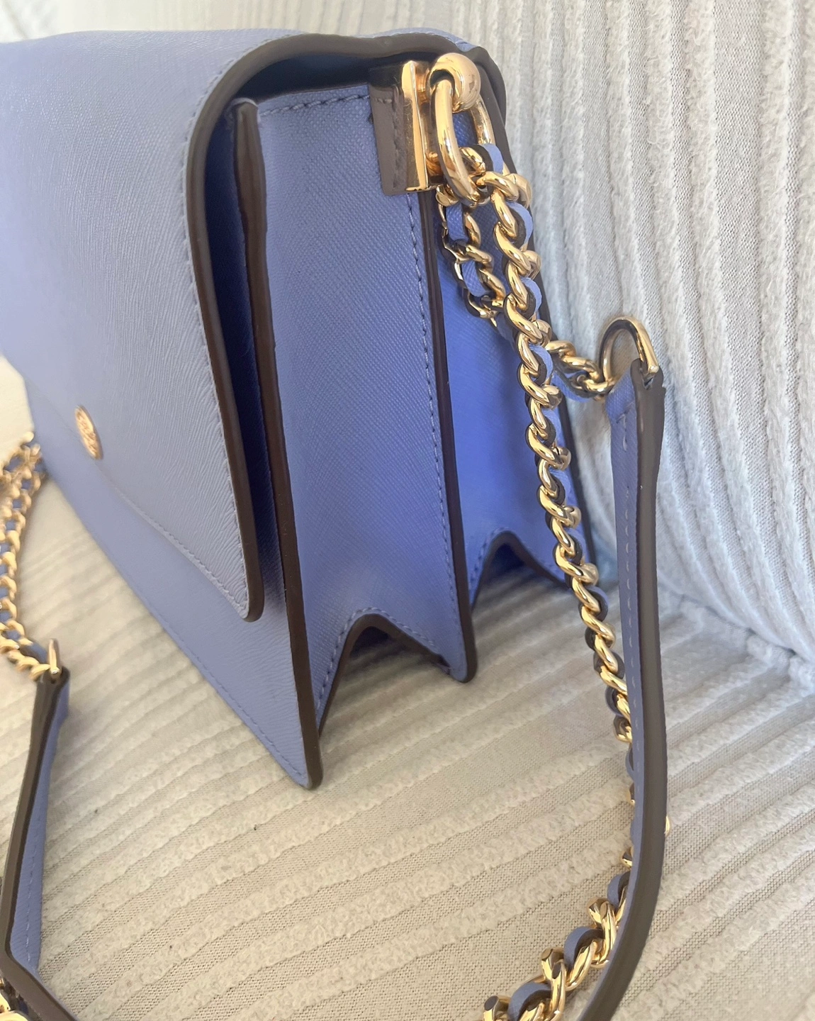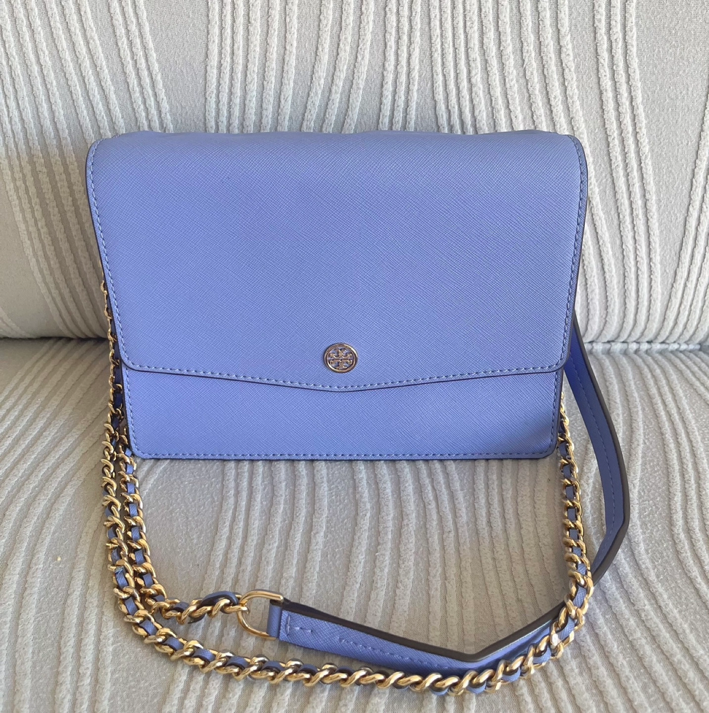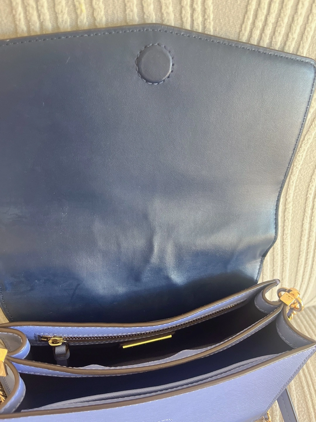 Blue purple dual-use bag, can be worn diagonally or with a retractable chain shoulder. There is a small flaw on the back, please refer to the last picture.Cash only