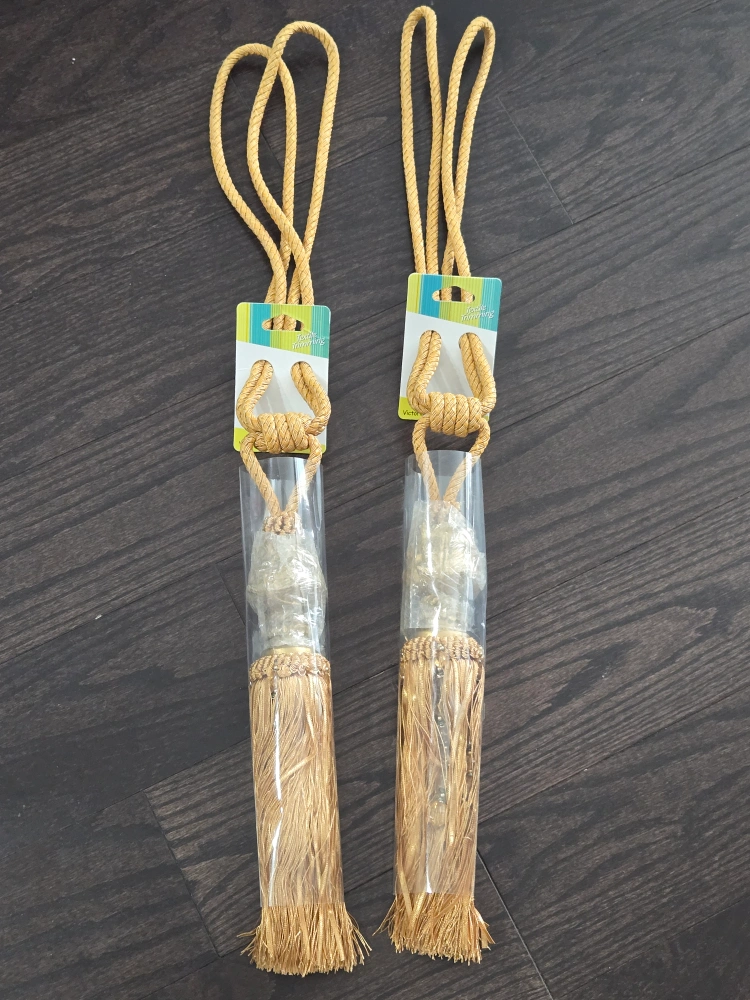 677Set of two decorative curtain tiebacks. Gold coloured rope and tassels. New in package.