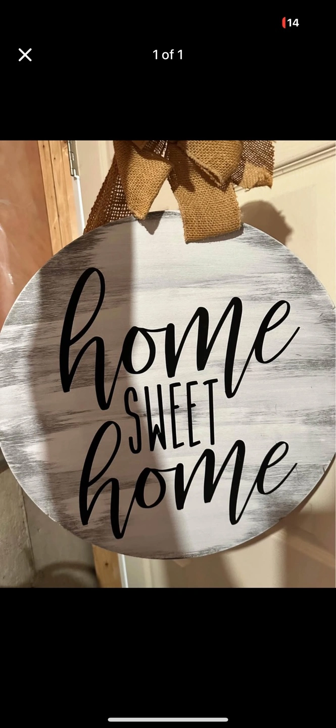 Round wooden sign. Features distressed white paint and black lettering. Says "Home Sweet Home". Includes burlap hanger. This was a custom order.