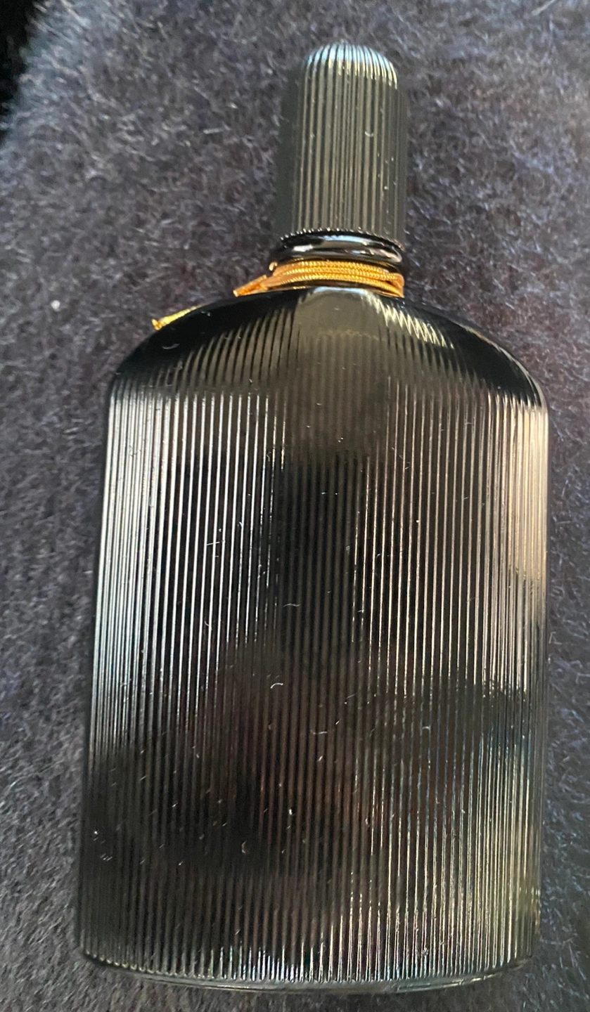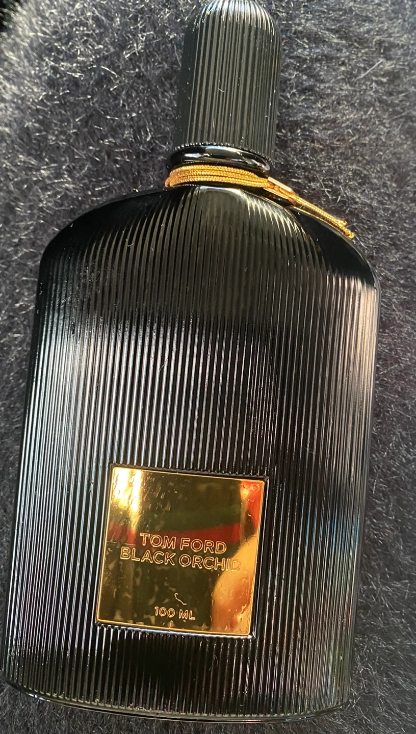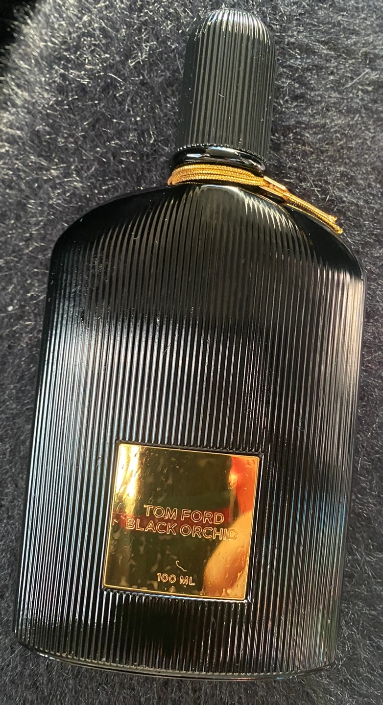 100ml bottle of Tom Ford Black Orchid perfume. Black ribbed glass bottle with gold accents. Beautiful fragrance.