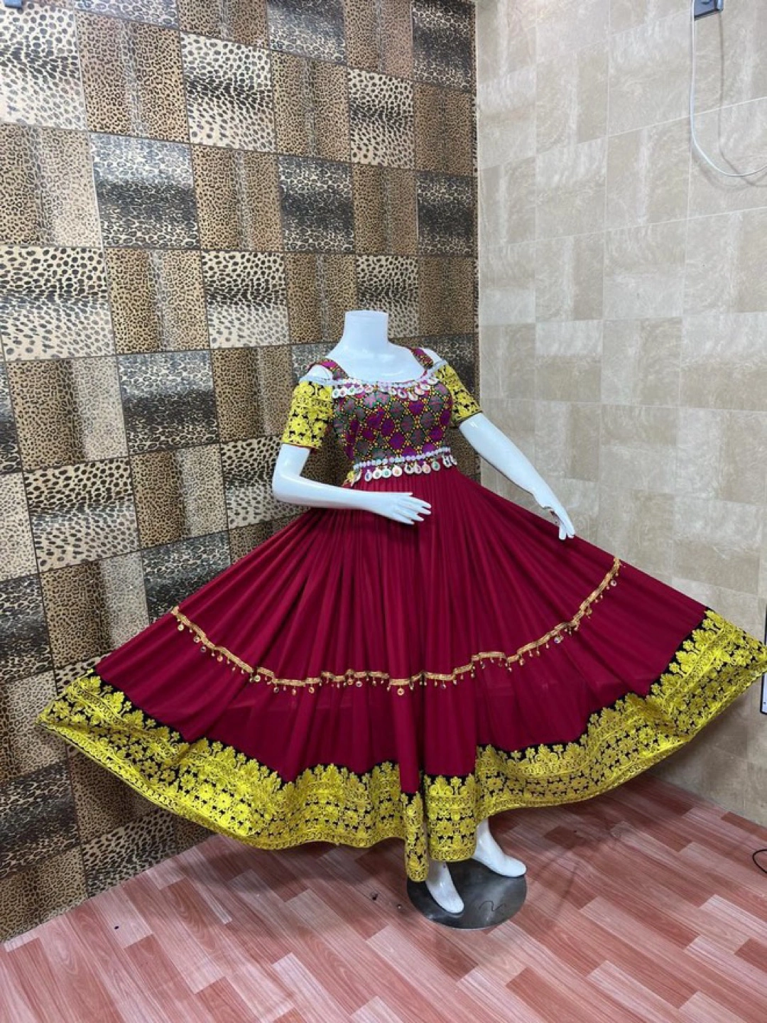 56Gorgeous maroon afghani dress. Features intricate gold embroidery. Full-length flared skirt. Short sleeves. Off-shoulder neckline. Decorated bodice. Ideal for special occasions. Size small and medium available