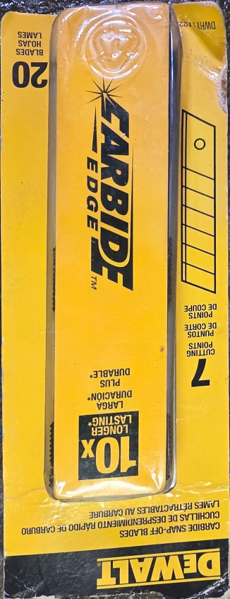 20 pack of DEWALT Carbide Edge utility knife blades. 10x longer lasting than competitor blades. Laser deposited carbide edges.