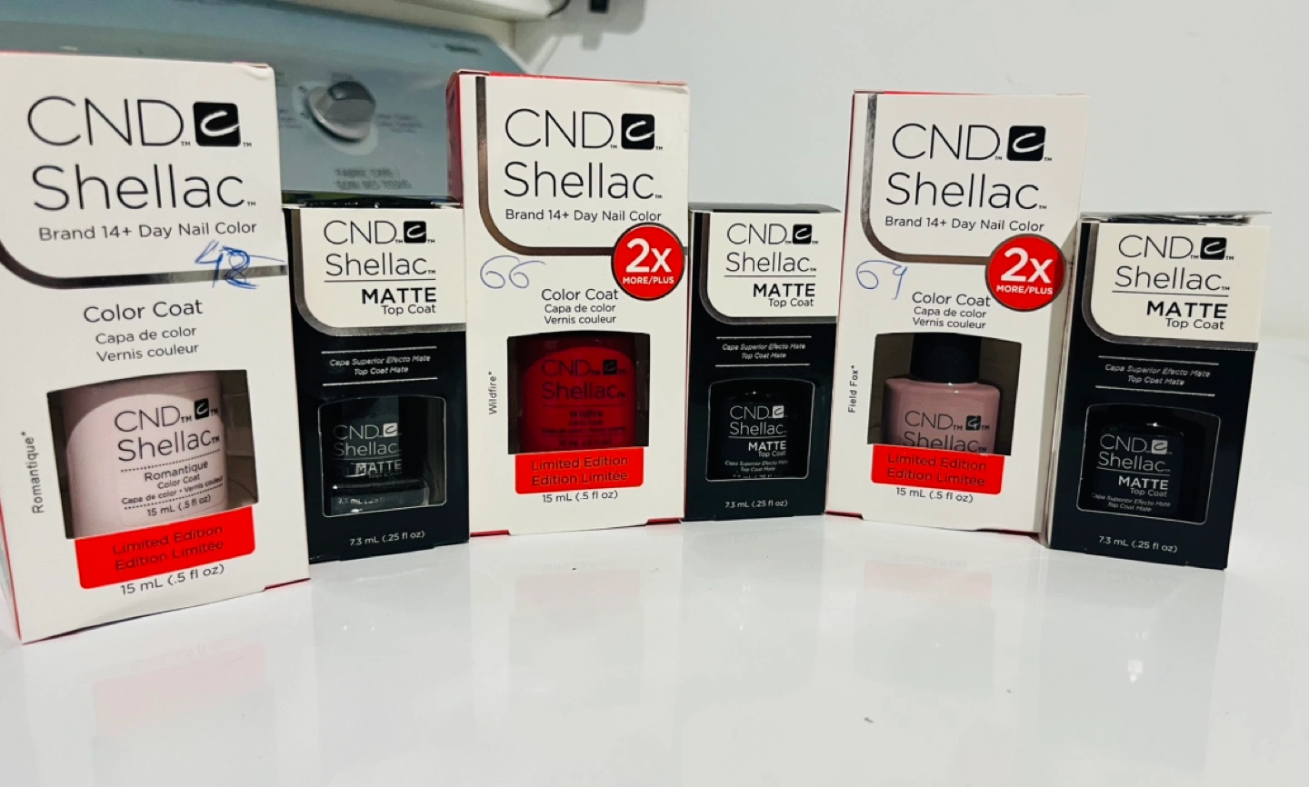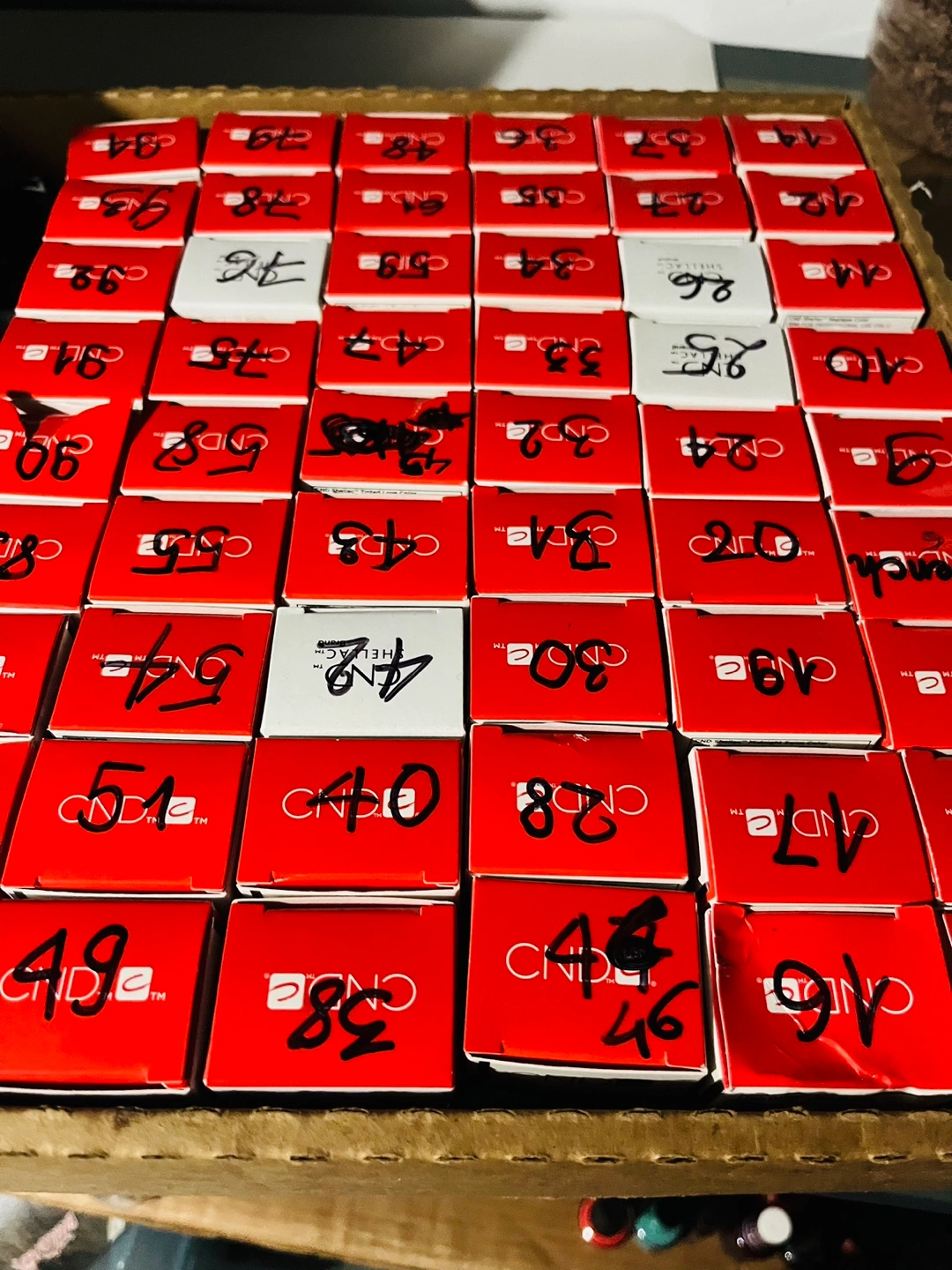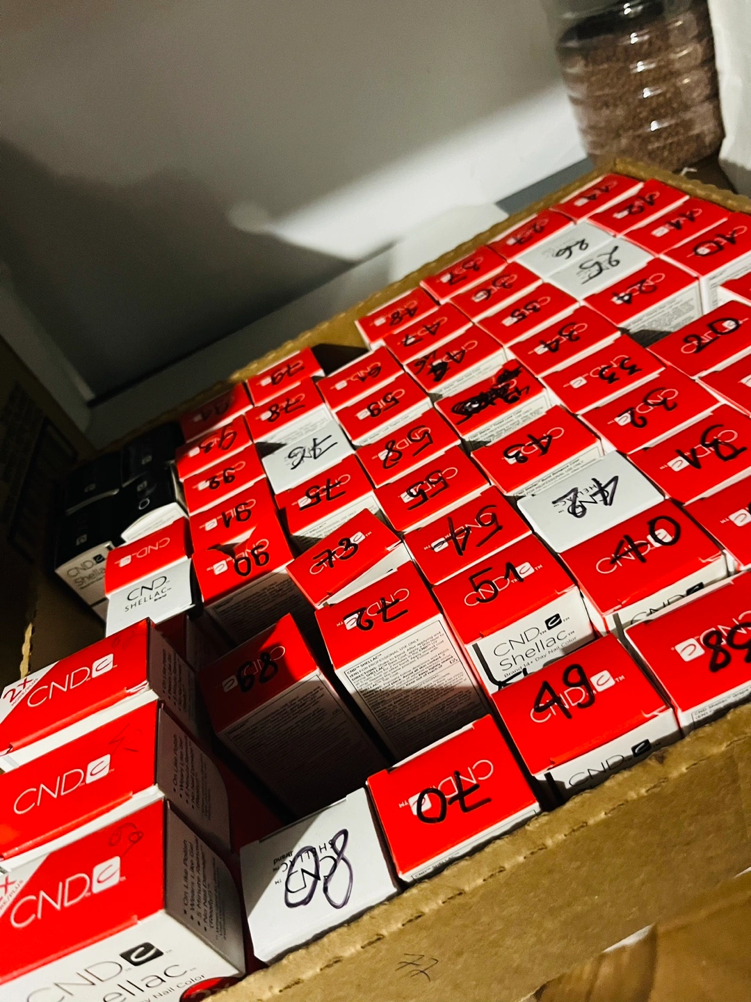 Large lot of CND Shellac nail polish. Various colours and sizes. Some boxes marked with numbers. Includes matte top coat and limited edition colours.each 12$ if you buy 10 each 10$ total 68 colour all to gather 600$