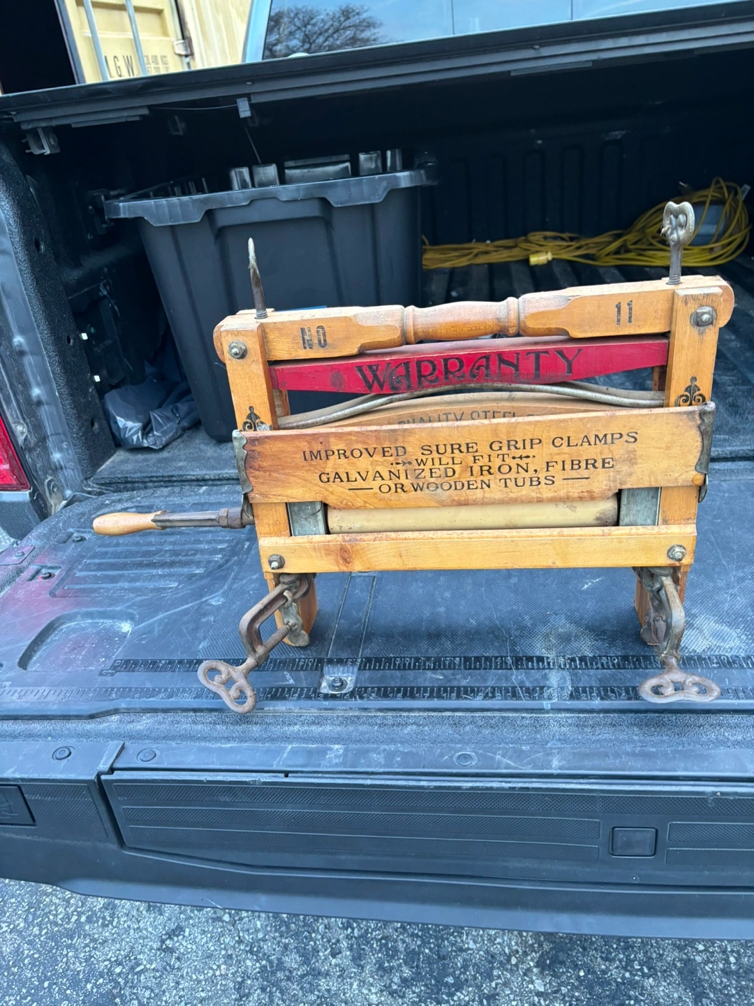 Vintage clothes wringer. Wooden construction. Steel rollers. Improved sure grip clamps. For galvanized iron, fibre or wooden tubs. Shows wear consistent with age.