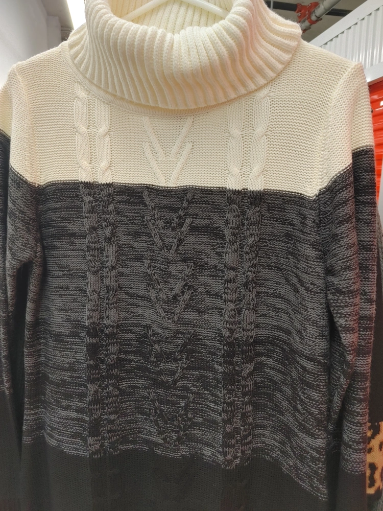 31Long-sleeved, colour-blocked turtleneck sweater. Features a cream-coloured top section and a dark grey bottom. Cable knit design throughout. Soft and comfortable material.