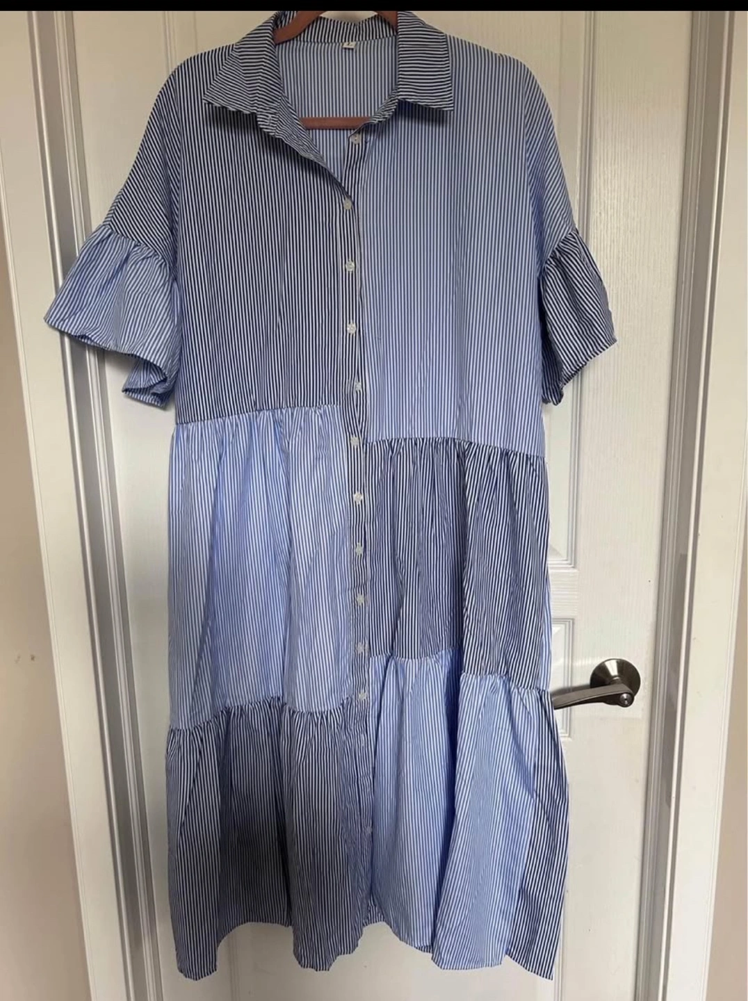 Cute blue and white striped shirt dress. Short sleeves, collared neckline, button closure. Tiered skirt. Relaxed fit.
