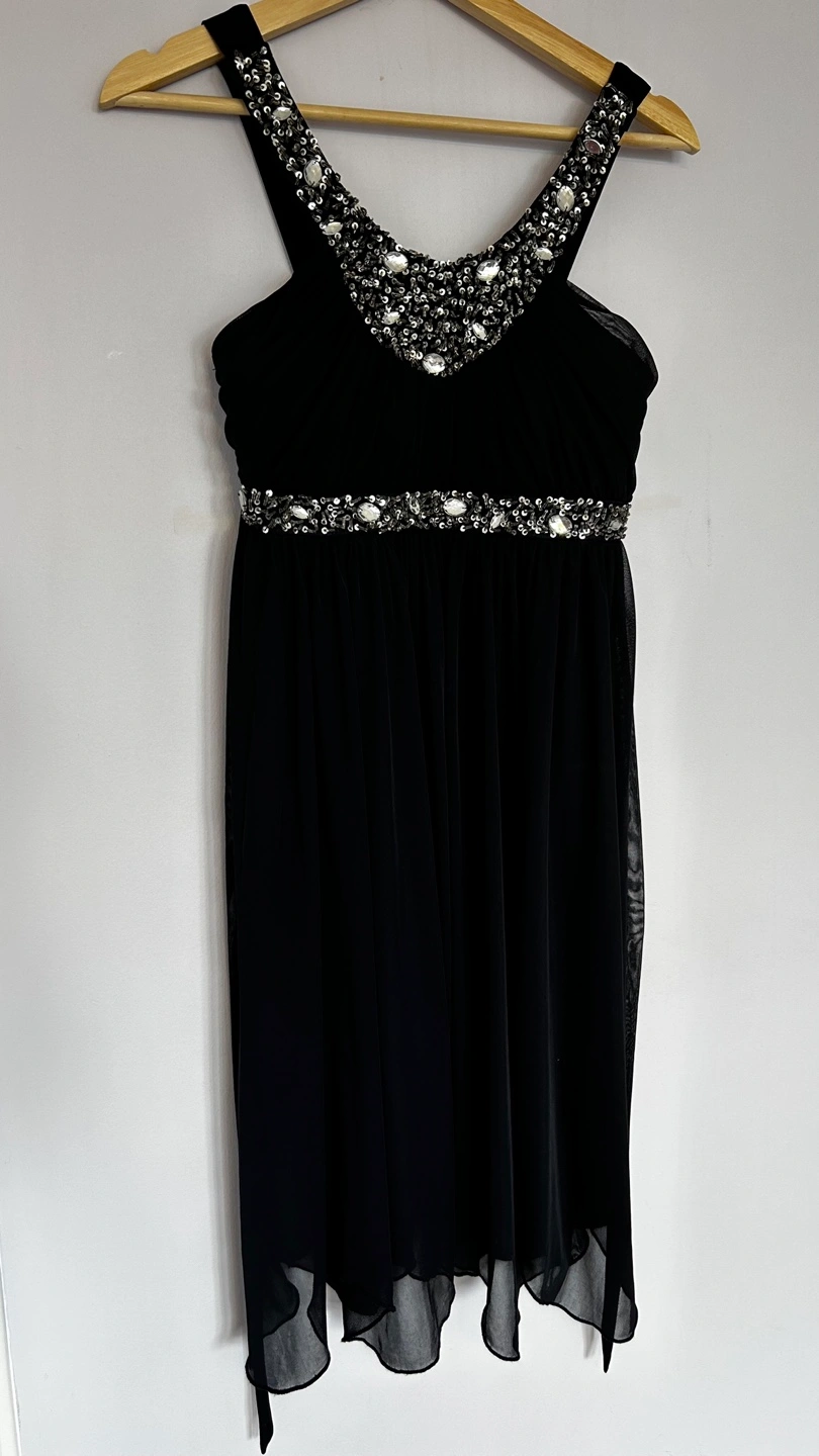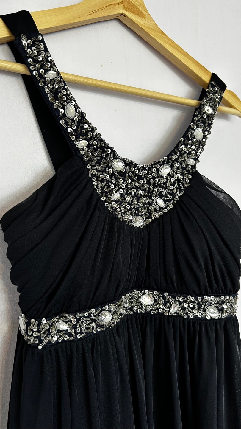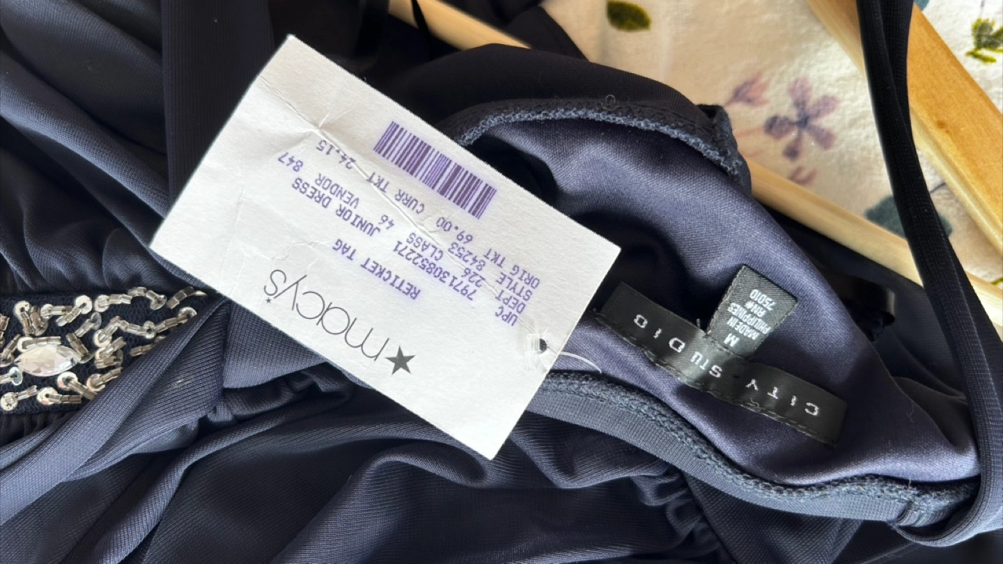 Stunning dark blue junior dress. Features a beaded neckline and empire waist. Flowy chiffon skirt. Size Medium. Macy's tag attached.