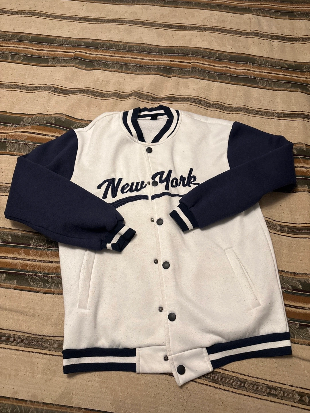 White and navy blue varsity jacket. Long sleeves, ribbed cuffs and hem. Like new condition.