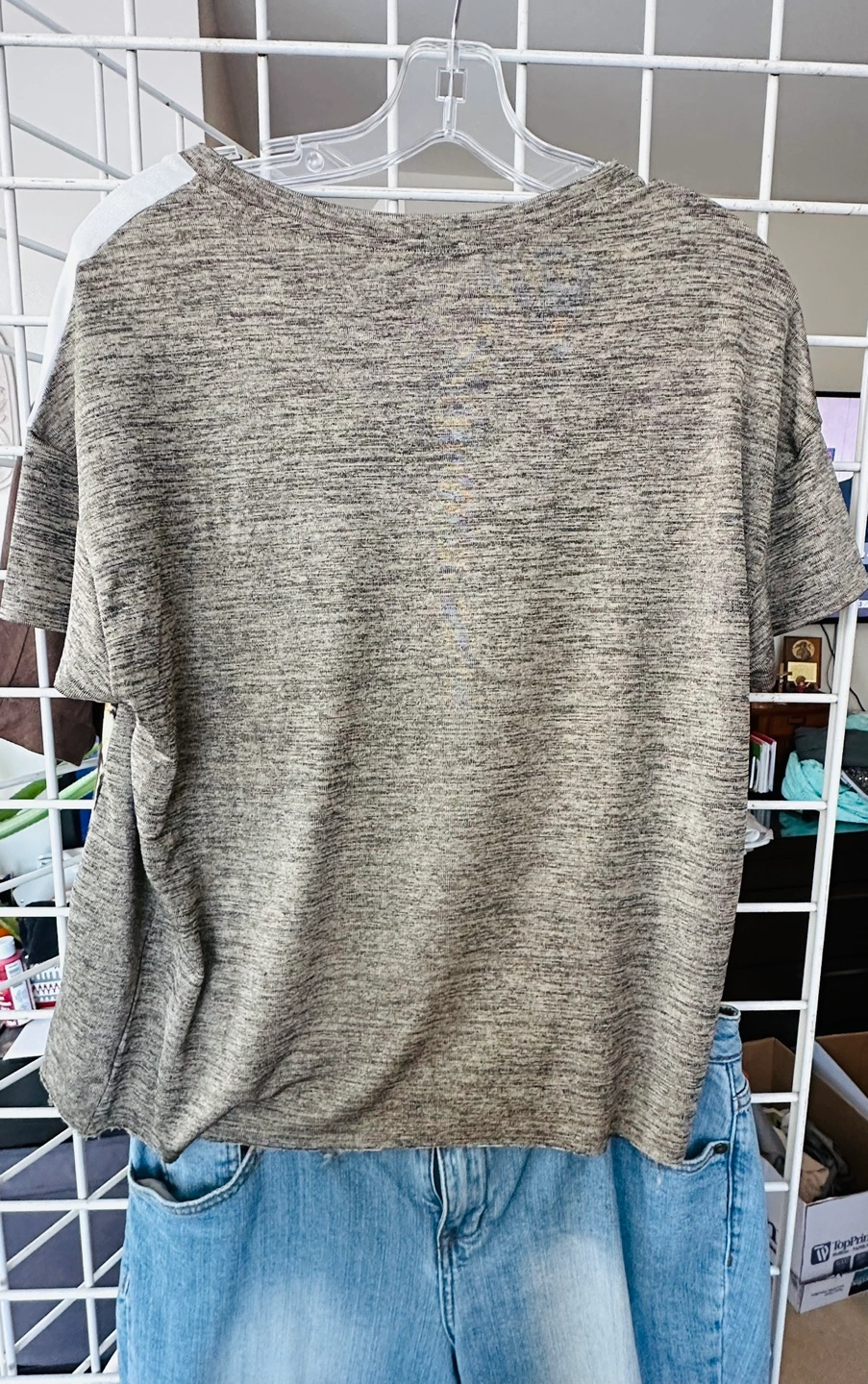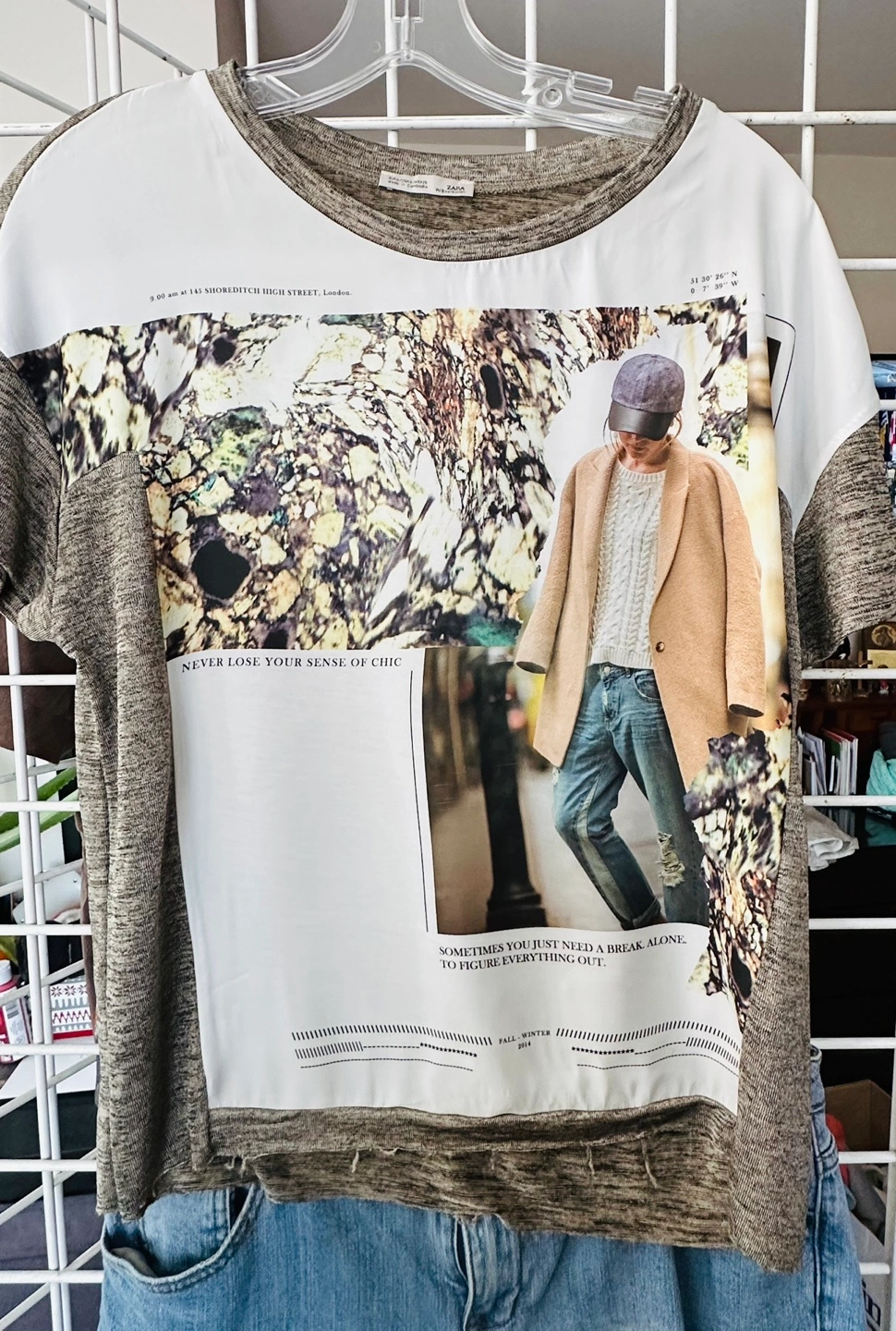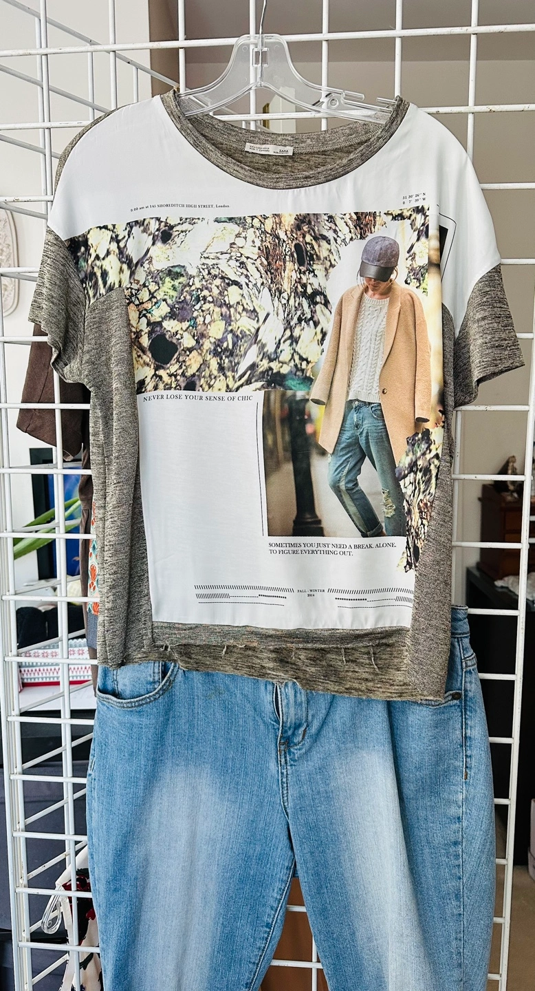 Grey and white graphic t-shirt. Short sleeves. Features a graphic print on the front. Size EUR/US/MEX 26. Made in Cambodia.