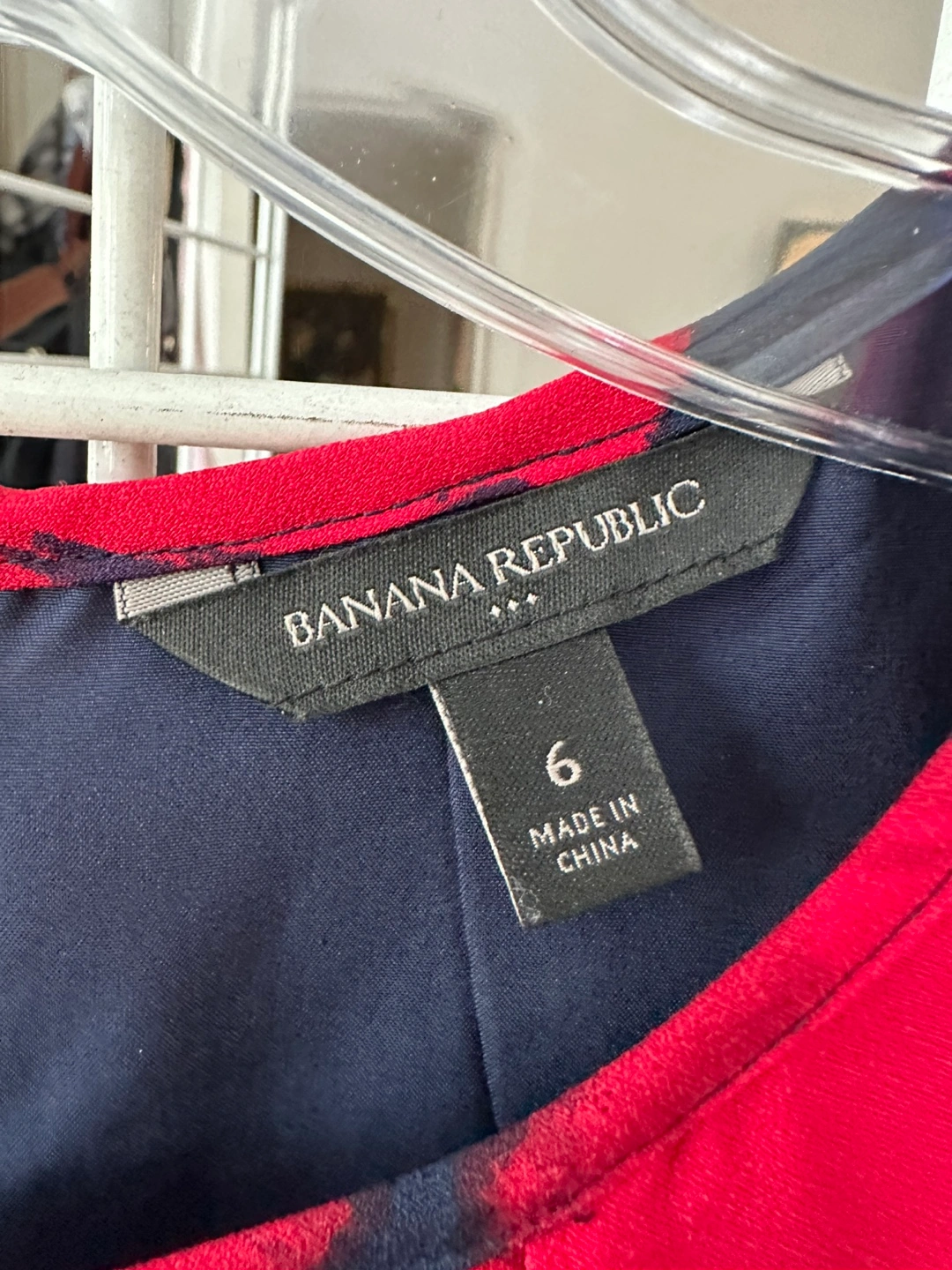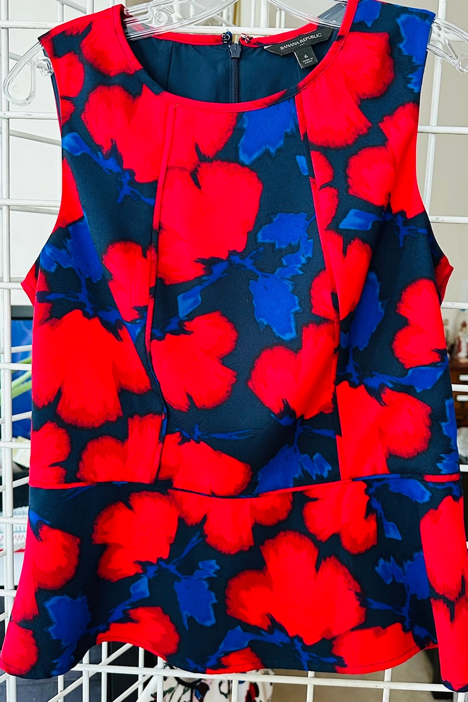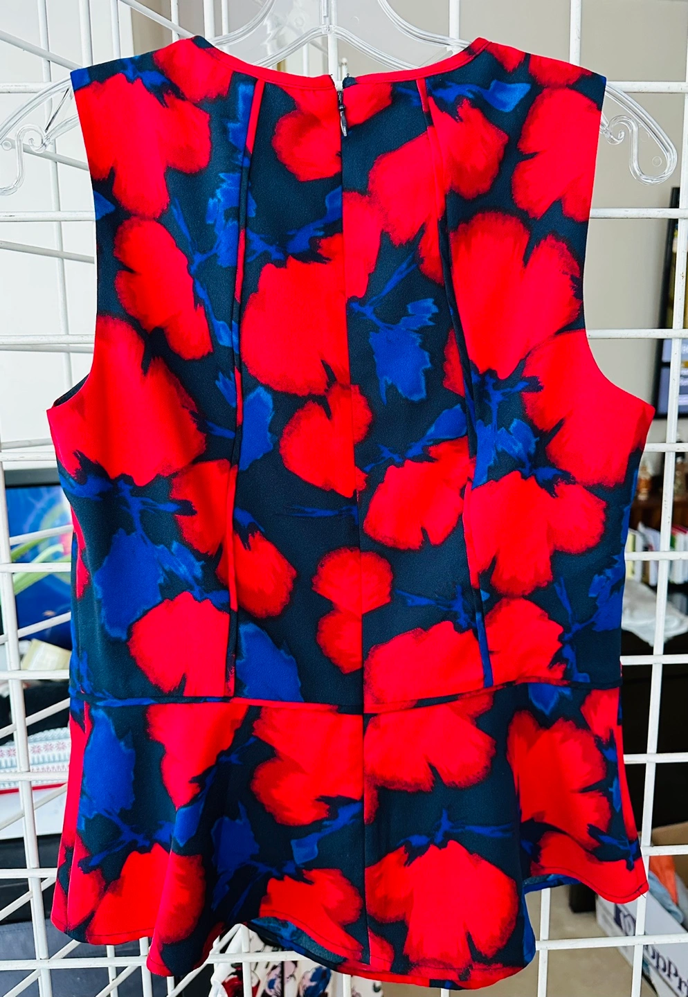 Women's sleeveless blouse. Red, blue, and black floral print. Size 6. Peplum hem. Back zipper.
