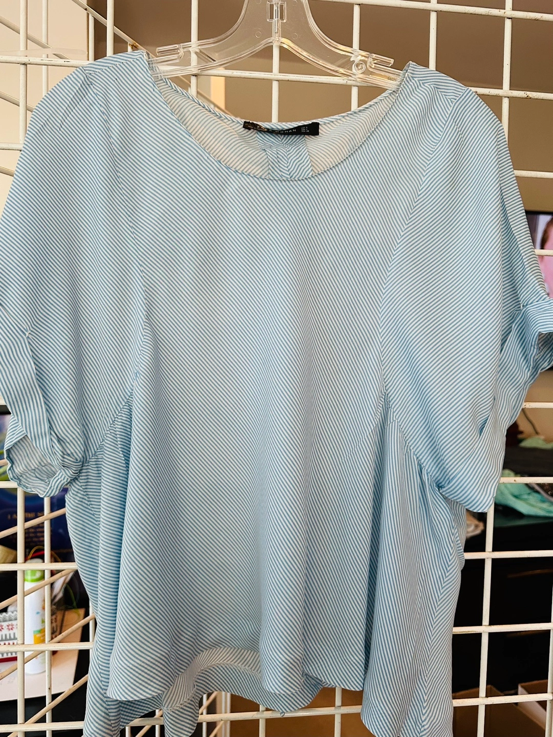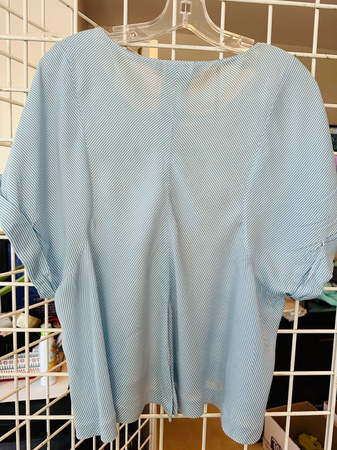 Women's light blue and white striped short sleeve blouse. Boxy fit. Size medium. Made in Morocco.