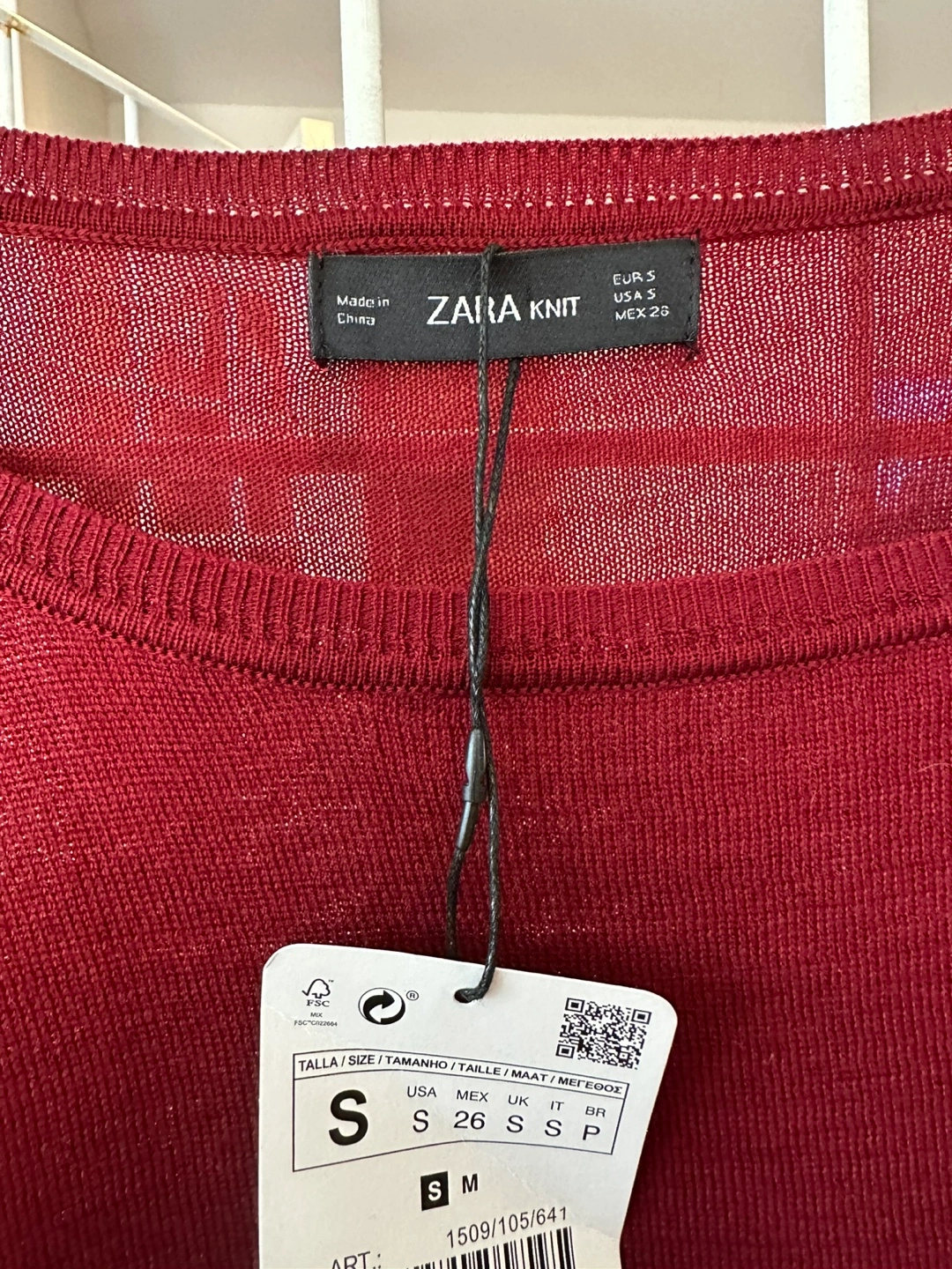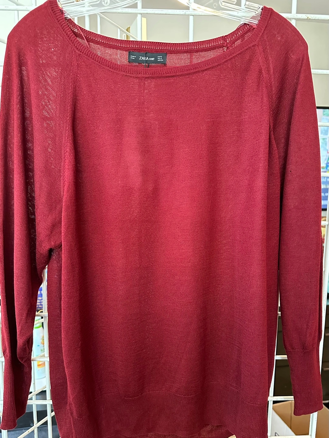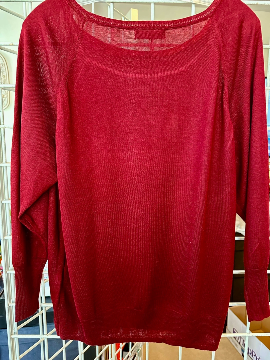 Maroon sweater, size small. Three-quarter sleeves. Boatneck. Lightweight knit. Made in China.