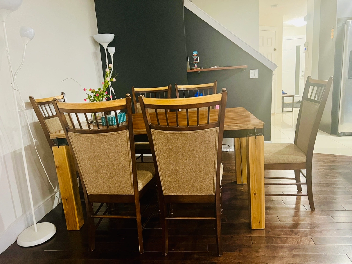 Dark brown wooden dining chairs. Beige fabric seats. Matching dining table with light brown wooden legs. Very good condition. Set includes six chairs and one table.