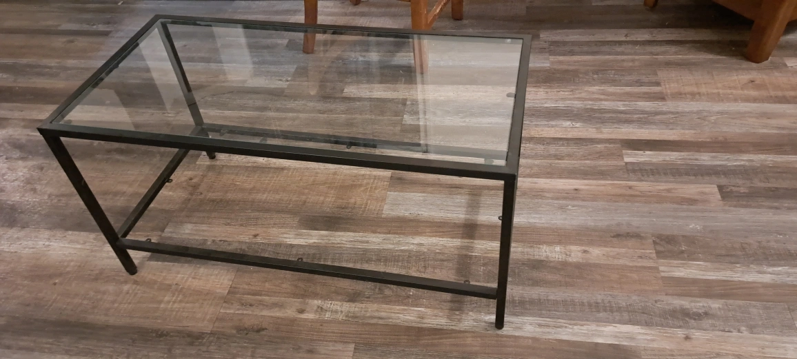 Modern coffee table. Features a glass top and a black metal frame. Good condition.