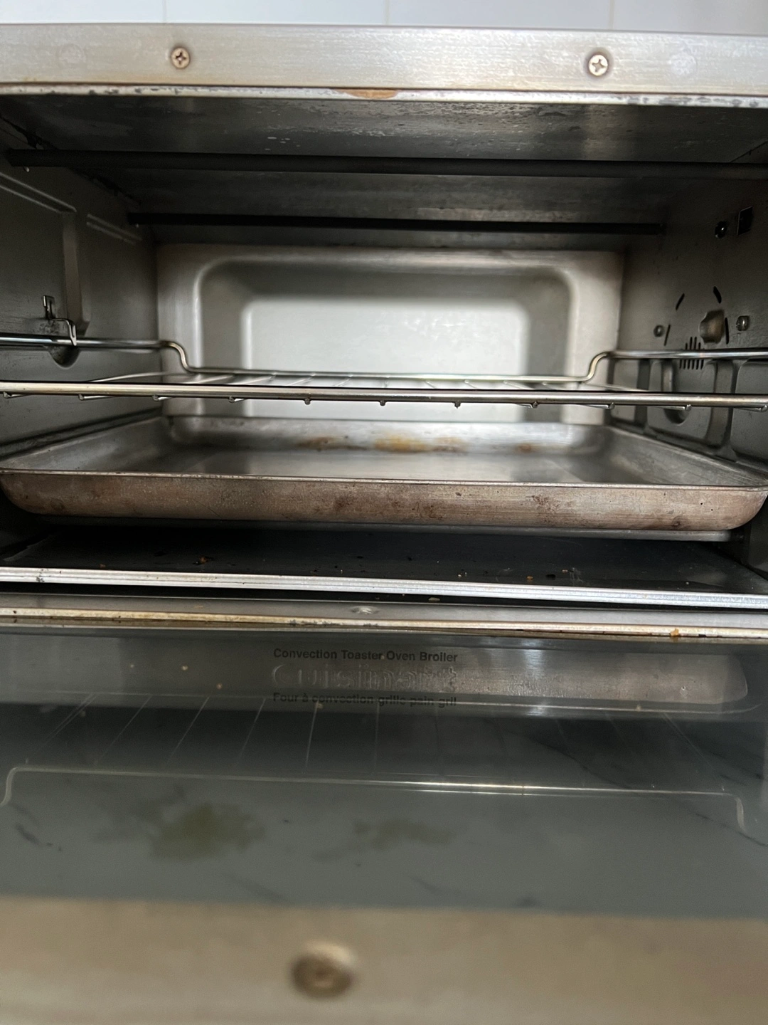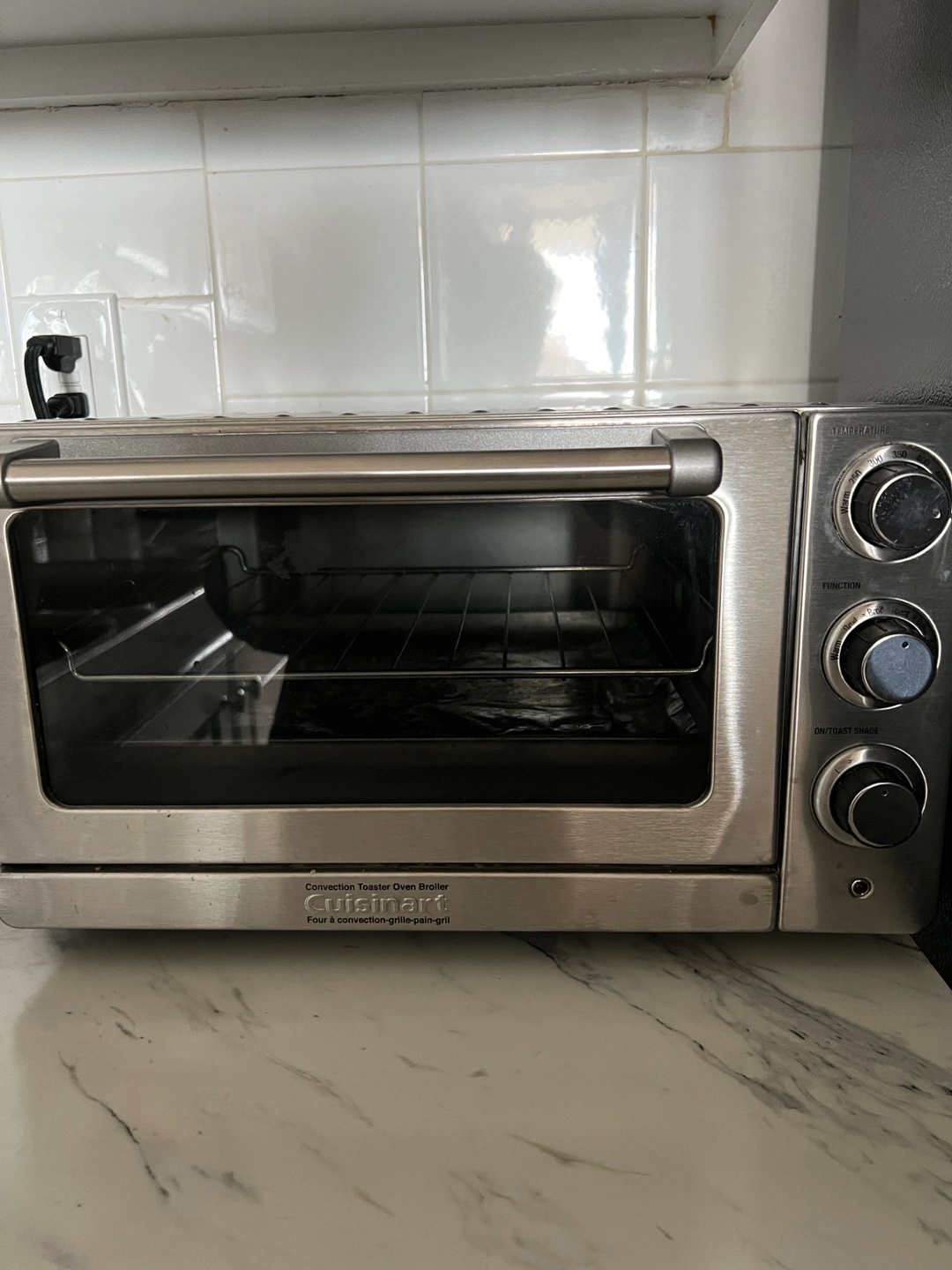Stainless steel convection toaster oven broiler. Features include broil, bake, and toast functions. Includes baking pan and wire rack. In very good condition.