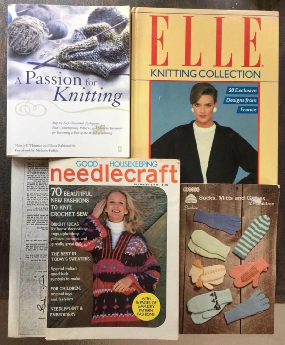 Collection of vintage knitting books and patterns. Includes Elle Knitting Collection, A Passion for Knitting, Good Housekeeping Needlecraft magazine, and a booklet of children's socks, mitts and gloves patterns. Various knitting and crochet projects.