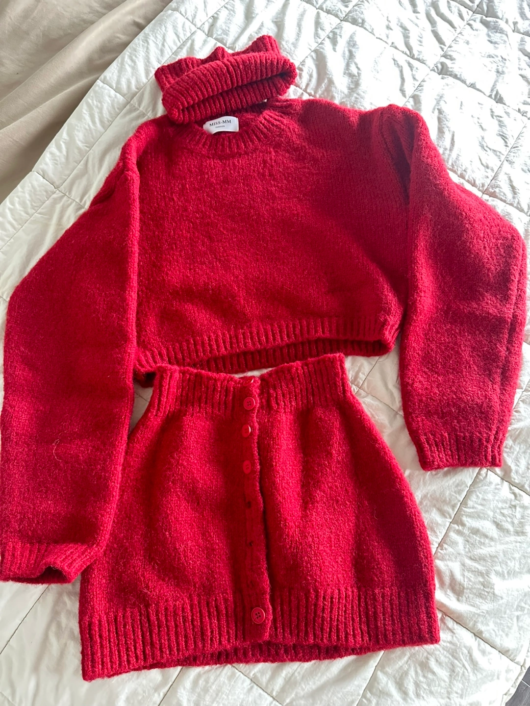 Adorable red knit co-ord set. Features cropped turtleneck sweater and matching mini skirt. Button detailing on skirt. Soft and cozy material. Perfect for a night out or casual wear.