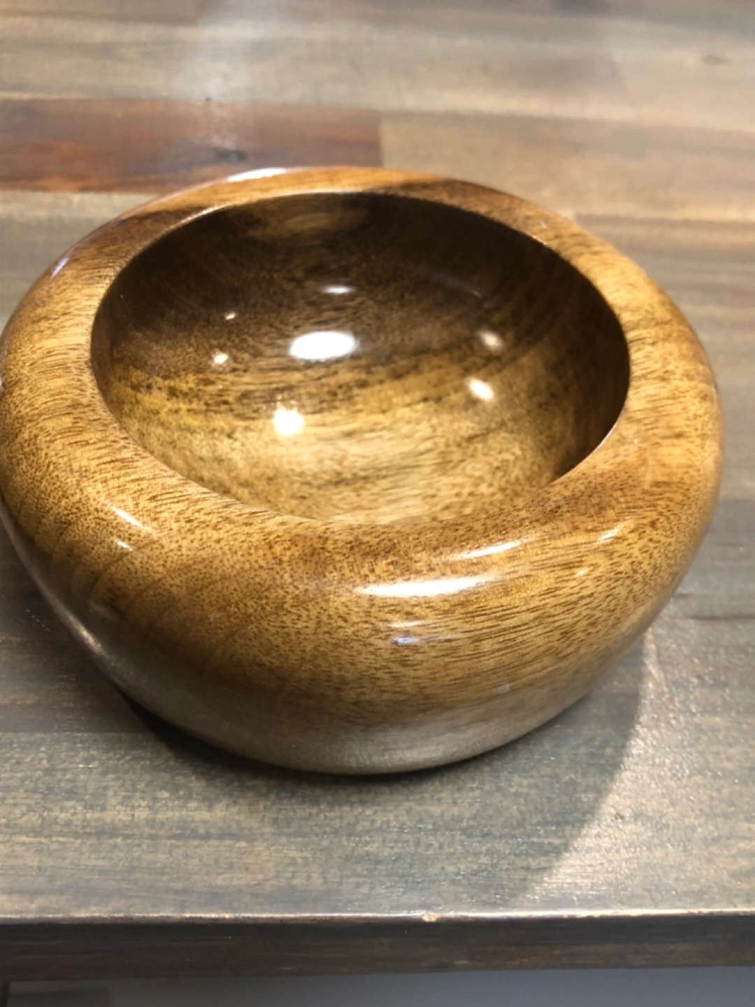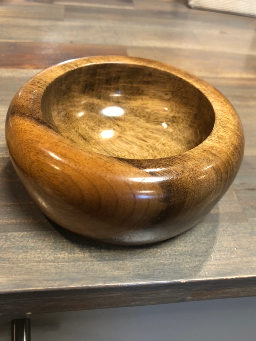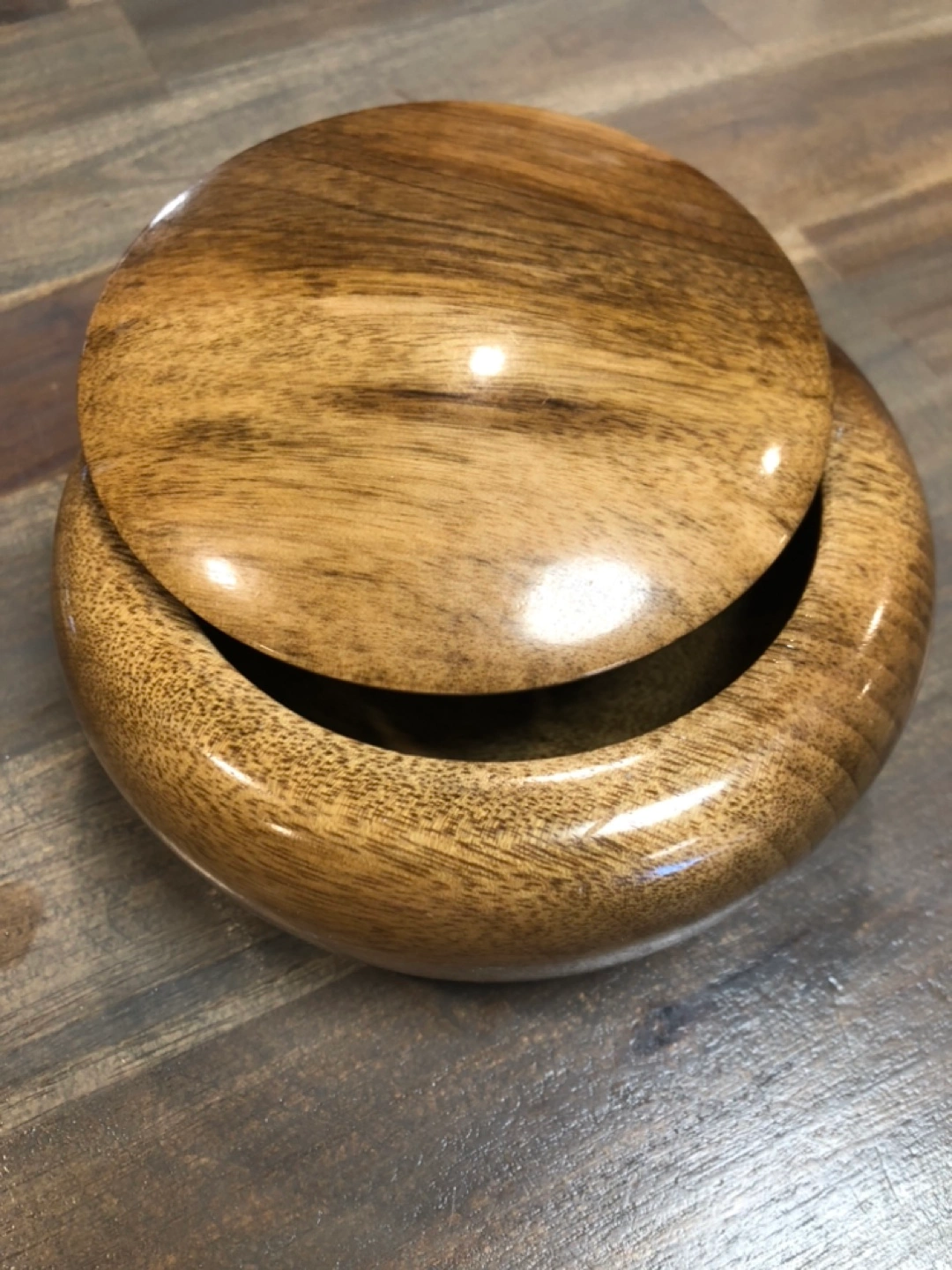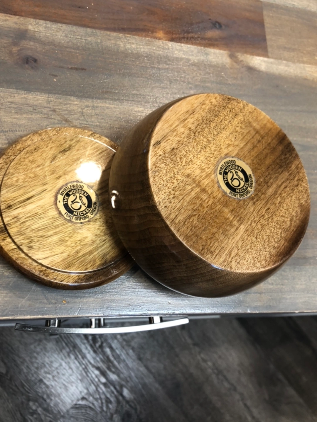 Hand-turned wooden bowl and lid. Dark brown finish, with a smooth finish. Features a branded bottom, that states it’s made of Myrtle Wood. A lovely, unique collectible.