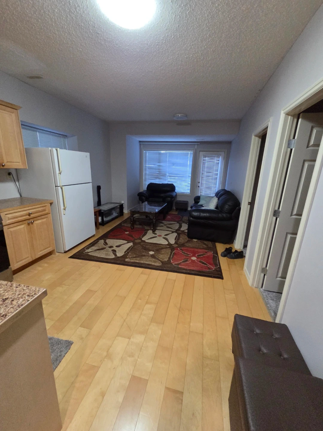 Compact kitchen space with light wood cabinetry, a white refrigerator, and a stainless steel range. Includes a coffee table with seating in the adjacent living area. Good for smaller spaces or as a secondary kitchen area.