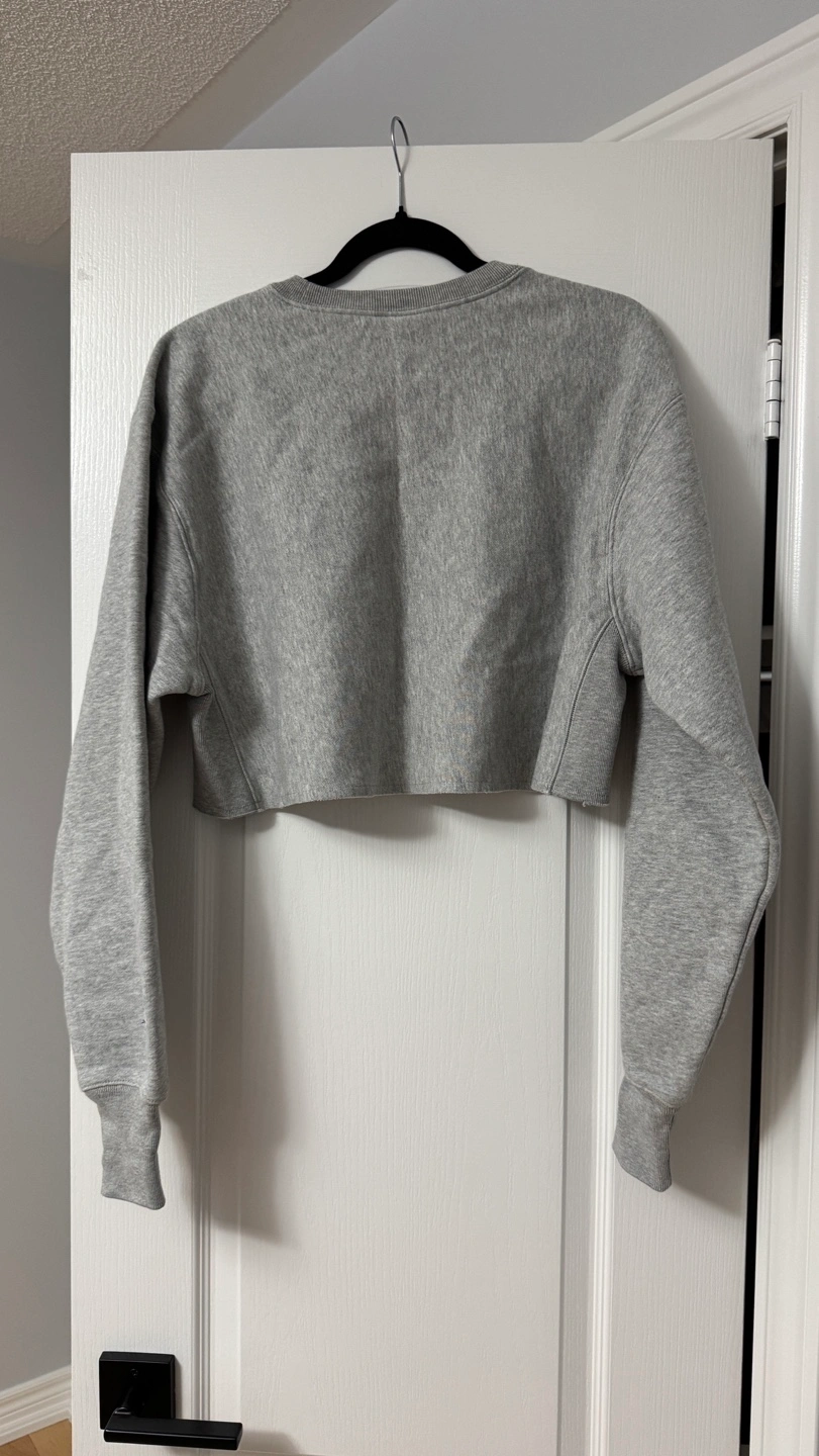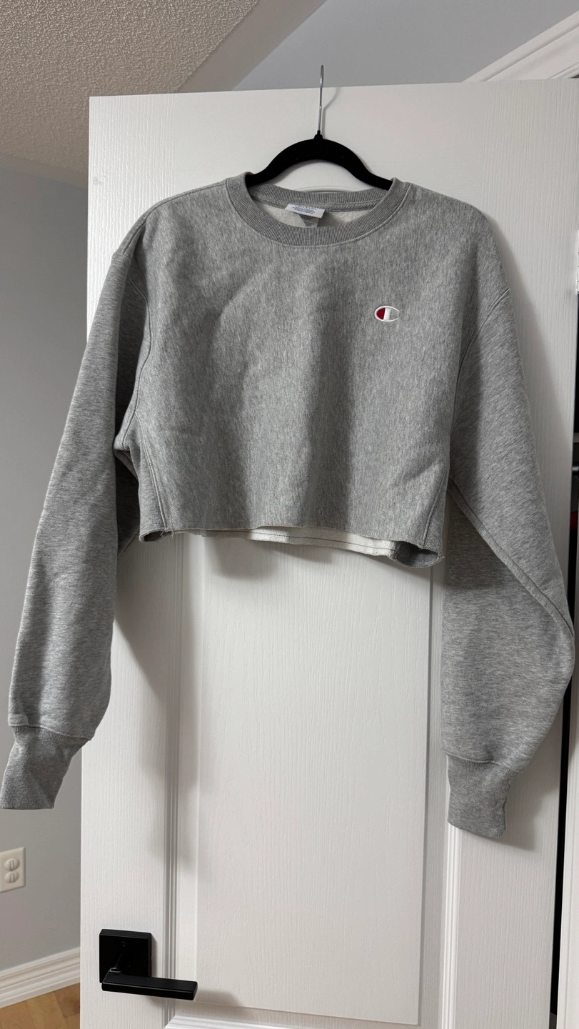 Grey cropped long sleeve sweatshirt. Small Champion logo on the front. Reverse weave. Medium size.