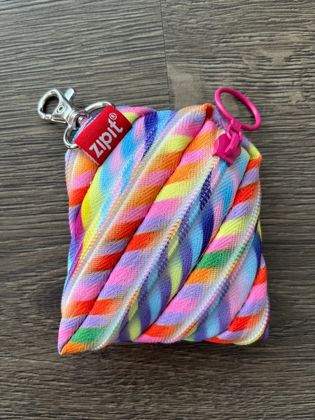 Small zipper pouch. Rainbow swirl design. Attached keychain. Perfect for keys, coins, or small items.