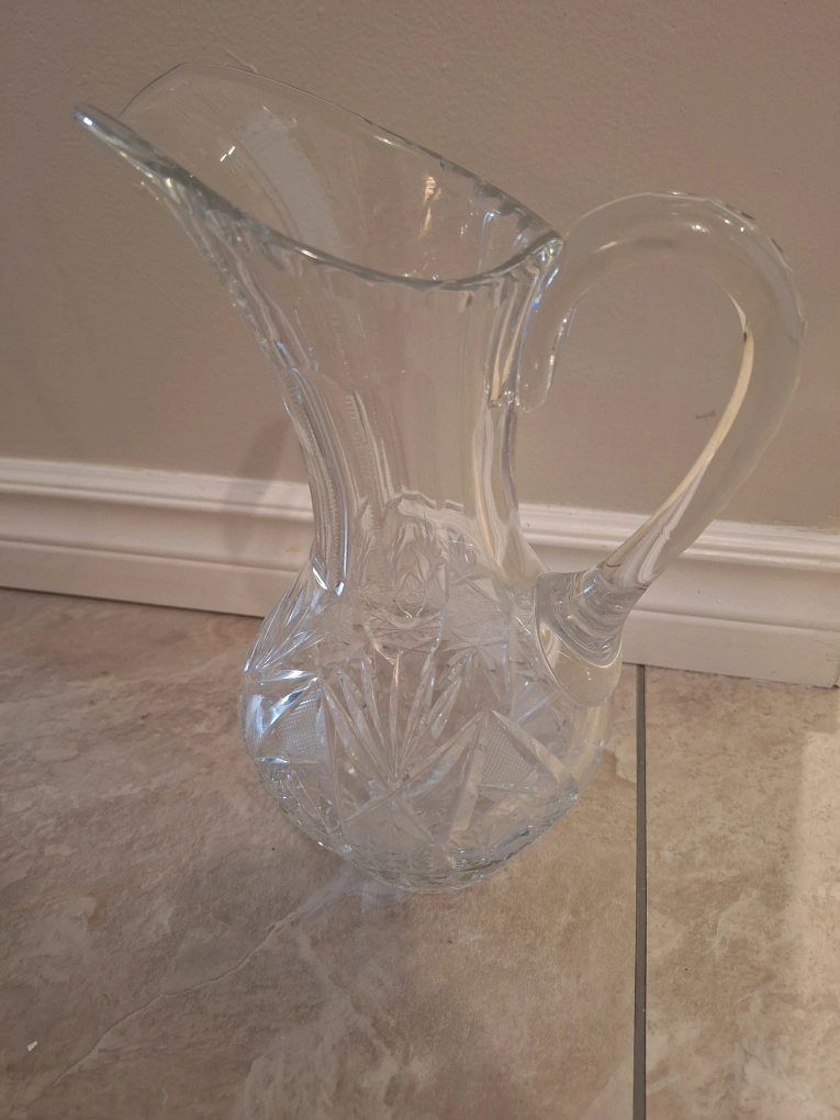 Elegant clear crystal pitcher. Features a cut glass design. Beautiful addition to any table setting.