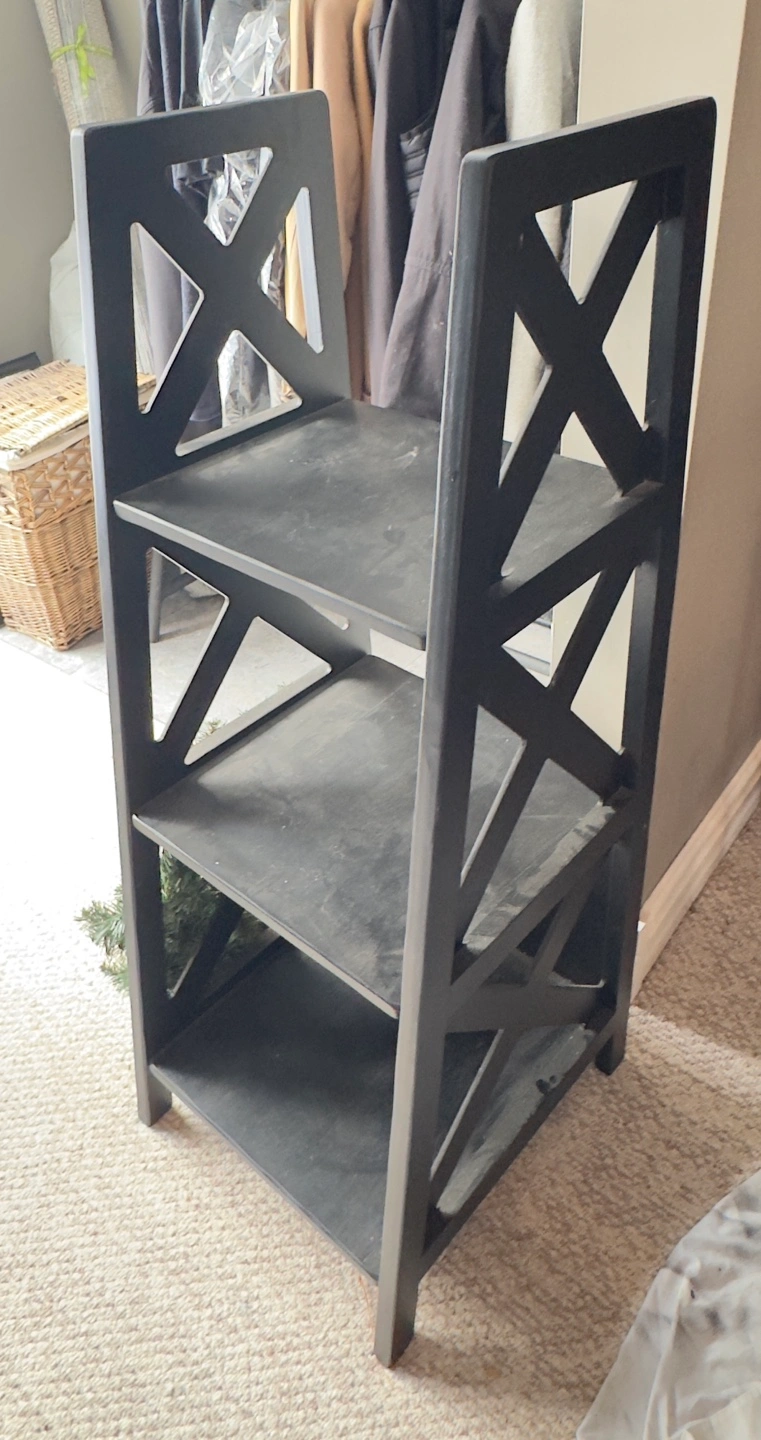Three-tier shelf unit. Black finish. Geometric cut-outs on sides. Good for storage or display.