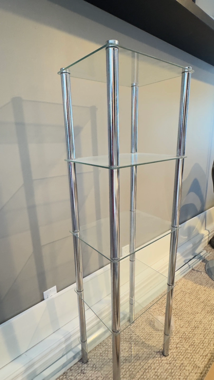 Four-tier shelving unit. Chrome metal frame. Glass shelves. Modern design. Perfect for organizing small items.