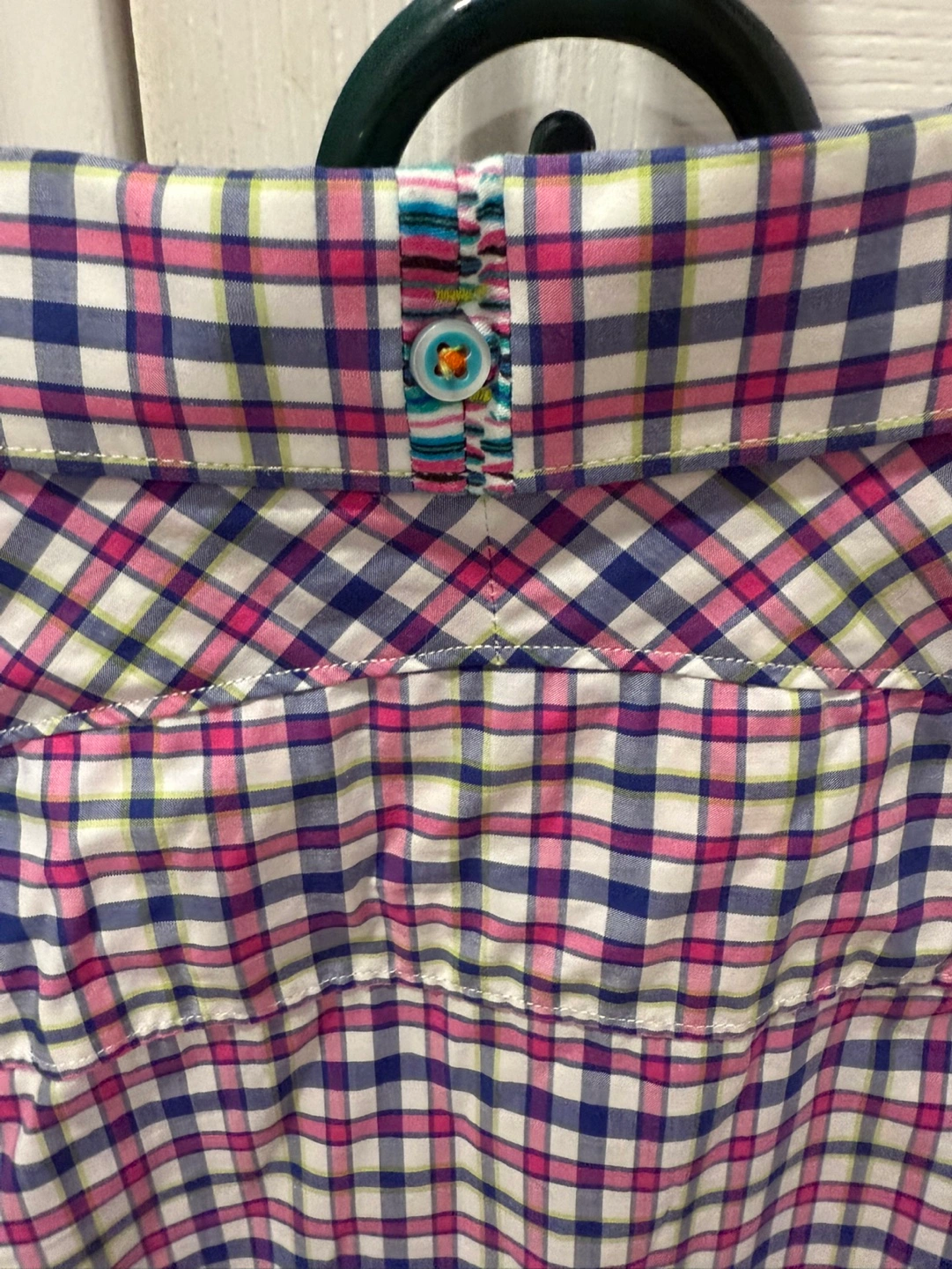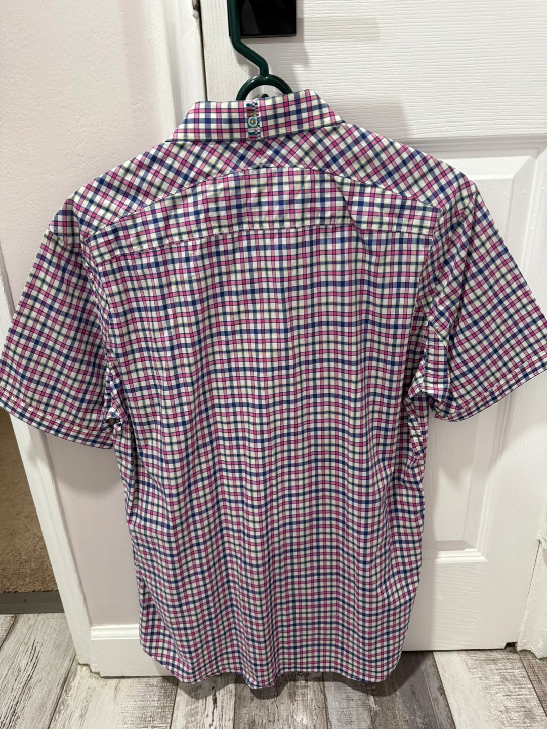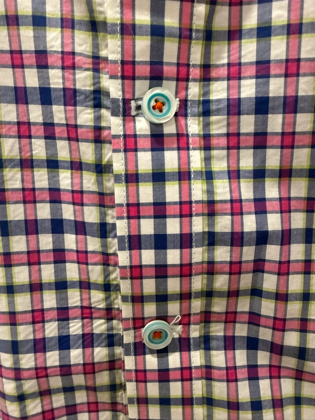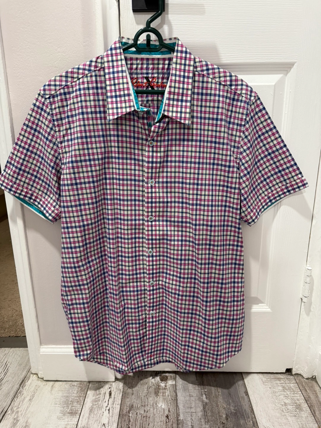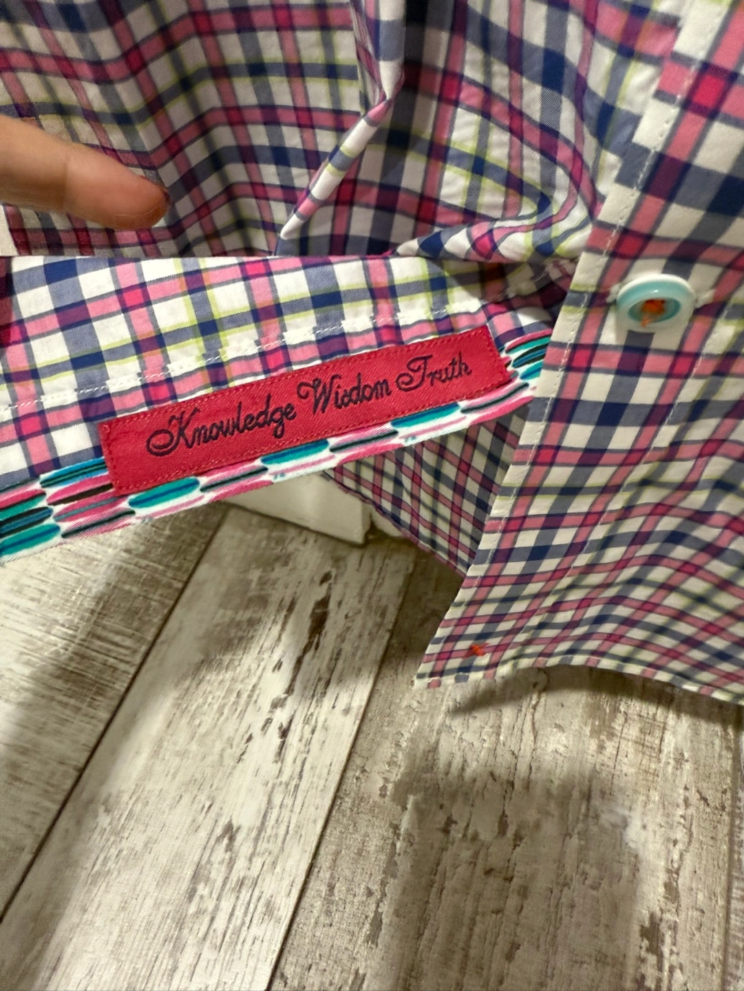 Men's short sleeve button down shirt. Pink, white, blue, and green plaid. Teal accents. Embroidered logo. Knowledge Wisdom Truth inner label. Size Large.