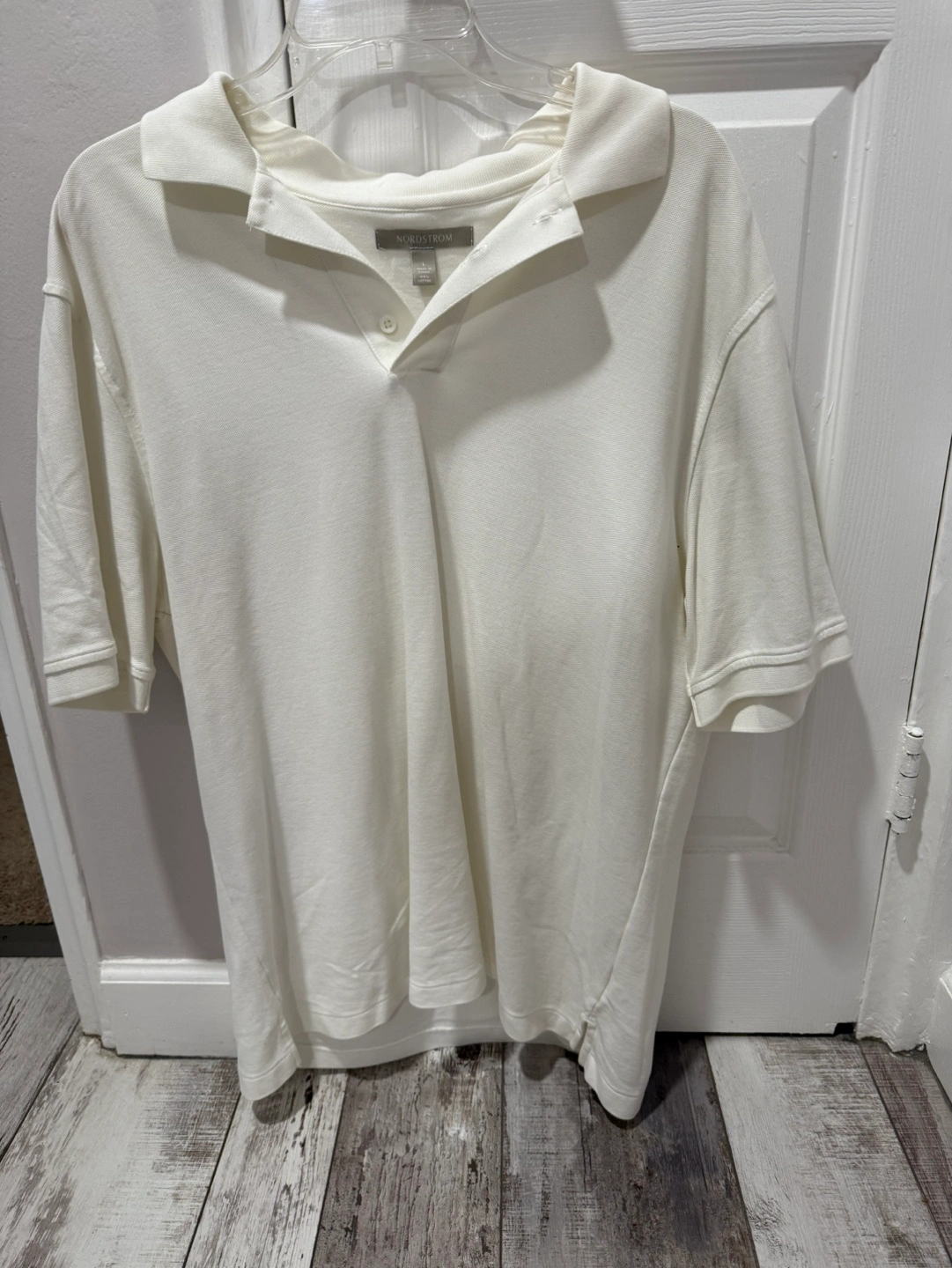 Men's size large white short sleeve polo shirt. 100% cotton. Classic style. Good for casual wear.