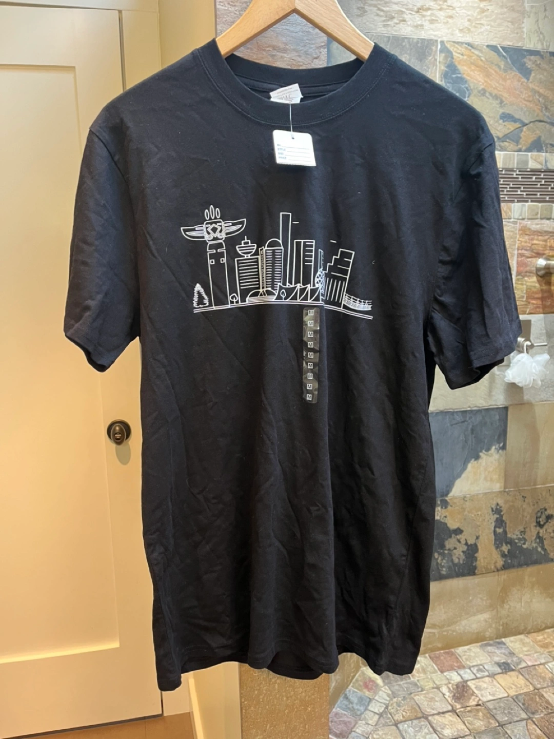 New with tags, black t-shirt featuring a Vancouver skyline graphic. Short sleeves, crew neck. Would be a great gift!