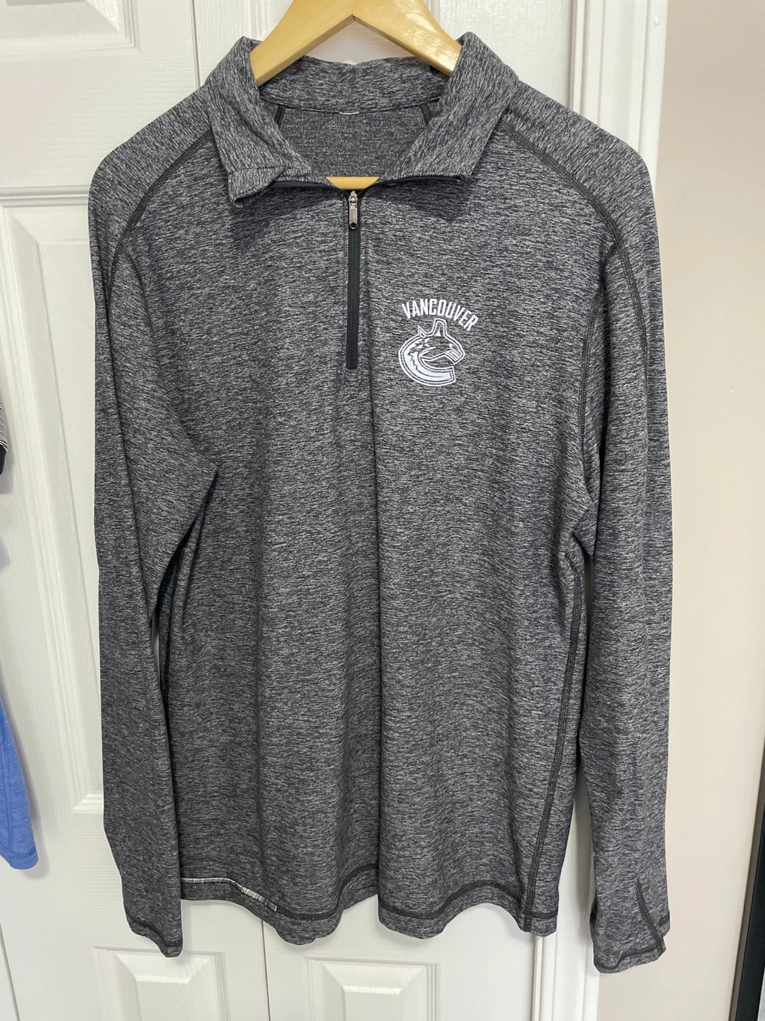 Grey heather Lululemon quarter zip. Features Canucks logo. Long sleeves. Great for layering or wearing alone.